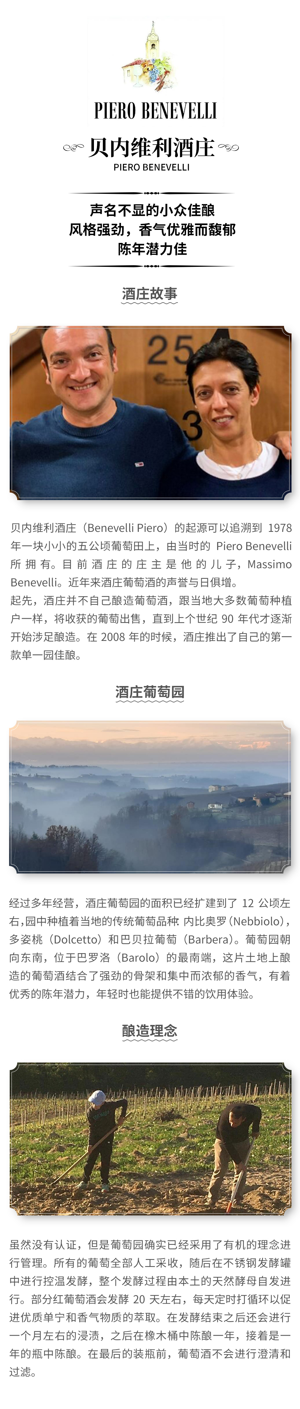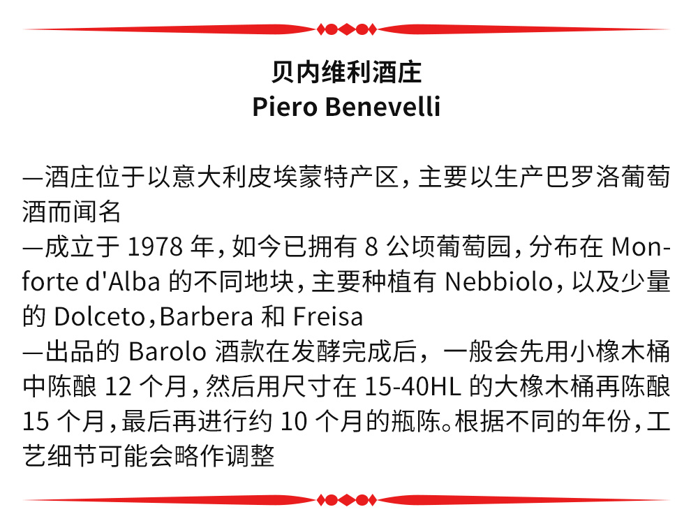 贝内维利酒庄(Benevelli Piero)的起源可以追溯到1978年一块小小的五公顷葡萄田上,由当时的Piero Benevelli所拥有。目前酒庄的庄主是他的儿子,Massimo Benevelli。近年来酒庄葡萄酒的声誉与日俱增。