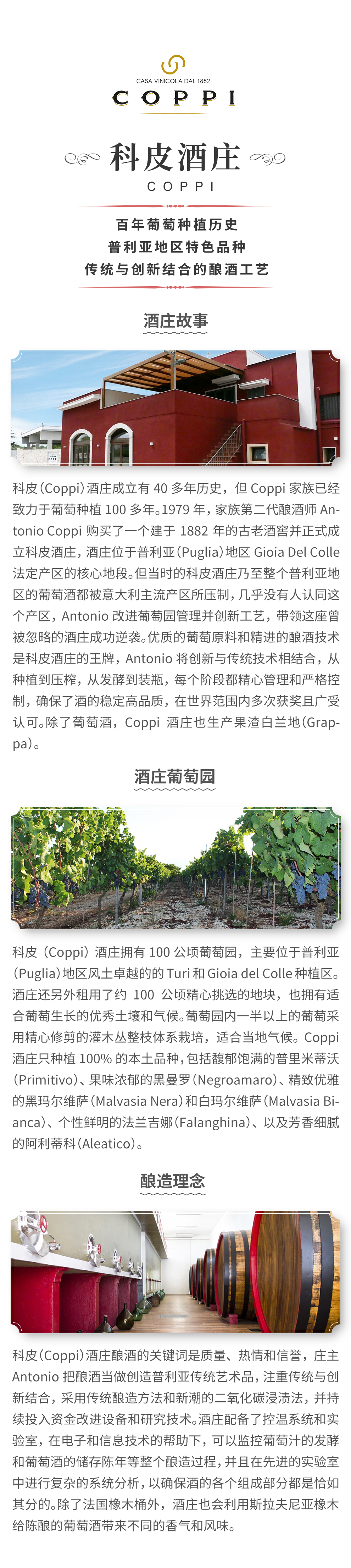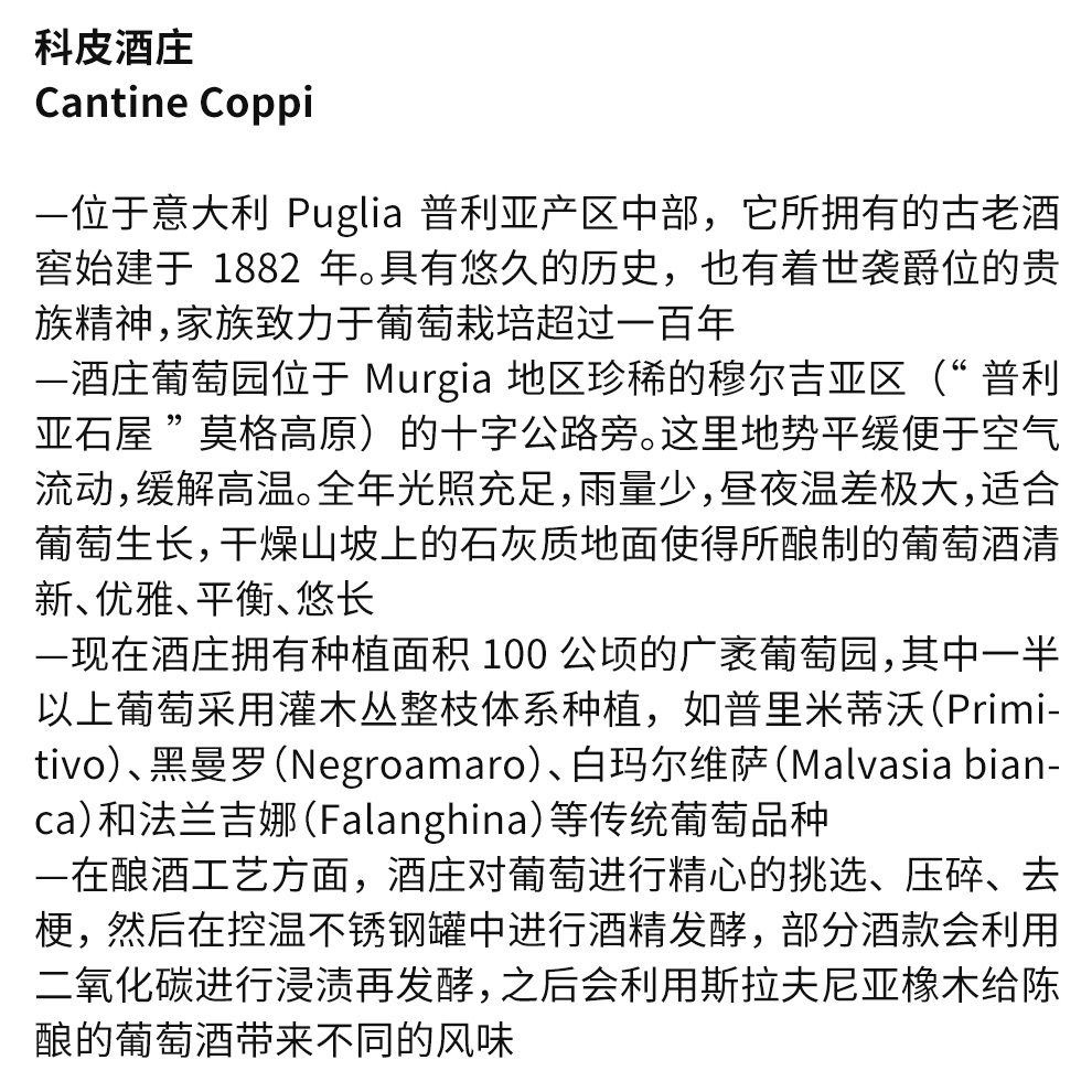 科皮(Coppi)酒庄成立有40多年历史,但Coppi家族已经致力于葡萄种植100多年。1979年,家族第二代酿酒师Antonio Coppi购买了一个建于1882年的古老酒窖并正式成立科皮酒庄,酒庄位于普利亚(Puglia)地区Gioia Del Colle法定产区的核心地段。但当时的科皮酒庄乃至整个普利亚地区的葡萄酒都被意大利主流产区所压制,几乎没有人认同这个产区,Antonio改进葡萄园管理并创新工艺,带领这座曾被忽略的酒庄成功逆袭。优质的葡萄原料和精进的酿酒技术是科皮酒庄的王牌,Antonio将创新与传统技术相结合,从种植到压榨,从发酵到装瓶,每个阶段都精心管理和严格控制,确保了酒的稳定高品质,在世界范围内多次获奖且广受认可。除了葡萄酒,Coppi酒庄也生产果渣白兰地(Grappa)。