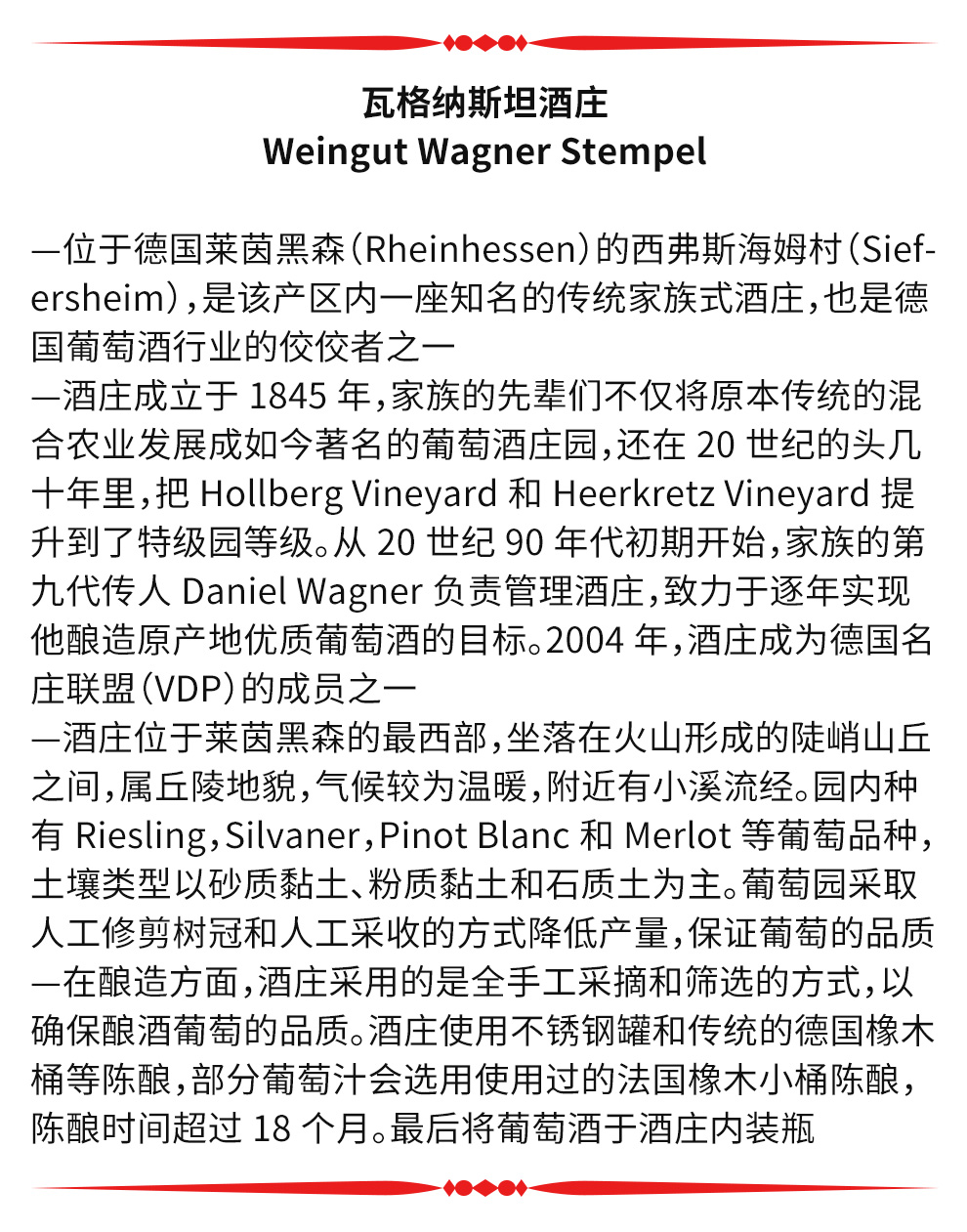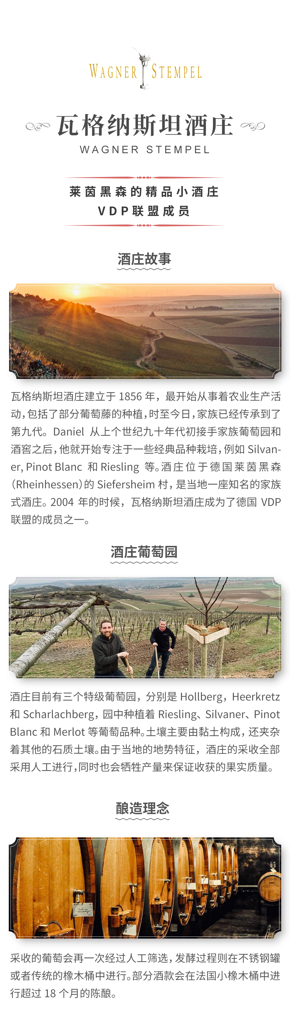 瓦格纳斯坦酒庄建立于1856年,最开始从事着农业生产活动,包括了部分葡萄藤的种植,时至今日,家族已经传承到了第九代。Daniel从上个世纪九十年代初接手家族葡萄园和酒窖之后,他就开始专注于一些经典品种栽培,例如Silvaner, Pinot Blanc和 Riesling等。酒庄位于德国莱茵黑森(Rheinhessen)的Siefersheim村,是当地一座知名的家族式酒庄。2004年的时候,瓦格纳斯坦酒庄成为了德国VDP联盟的成员之一。