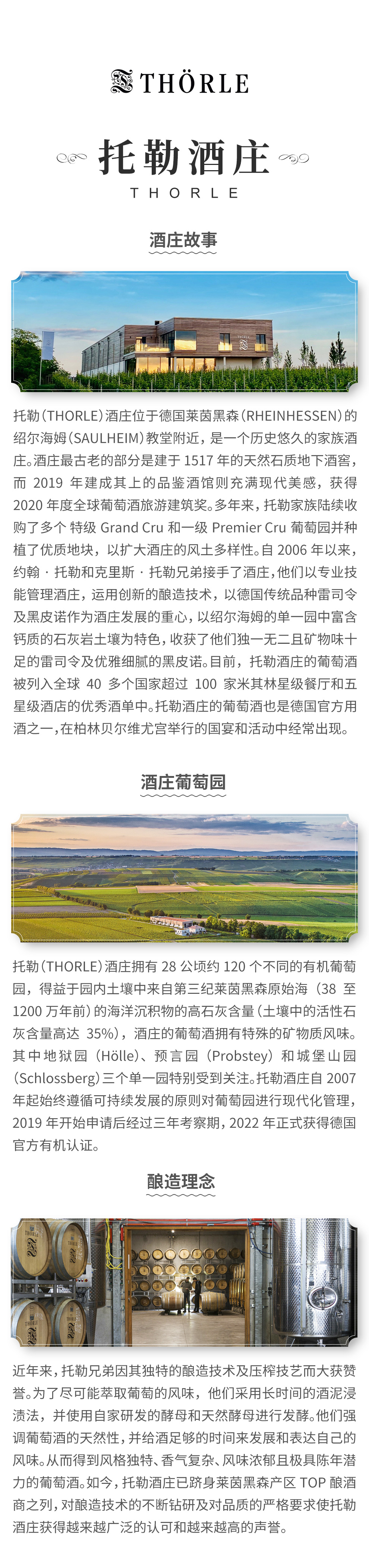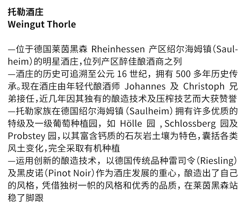 托勒(THORLE)酒庄位于德国莱茵黑森(RHEINHESSEN)的绍尔海姆(SAULHEIM)教堂附近,是一个历史悠久的家族酒庄。酒庄最古老的部分是建于1517年的天然石质地下酒窖,而2019年建成其上的品鉴酒馆则充满现代美感,获得2020年度全球葡萄酒旅游建筑奖。多年来,托勒家族陆续收购了多个 特级Grand Cru和一级Premier Cru葡萄园并种植了优质地块,以扩大酒庄的风土多样性。自2006年以来,约翰·托勒和克里斯·托勒兄弟接手了酒庄,他们以专业技能管理酒庄,运用创新的酿造技术,以德国传统品种雷司令及黑皮诺作为酒庄发展的重心,以绍尔海姆的单一园中富含钙质的石灰岩土壤为特色,收获了他们独一无二且矿物味十足的雷司令及优雅细腻的黑皮诺。目前,托勒酒庄的葡萄酒被列入全球40多个国家超过100家米其林星级餐厅和五星级酒店的优秀酒单中。托勒酒庄的葡萄酒也是德国官方用酒之一,在柏林贝尔维尤宫举行的国宴和活动中经常出现。