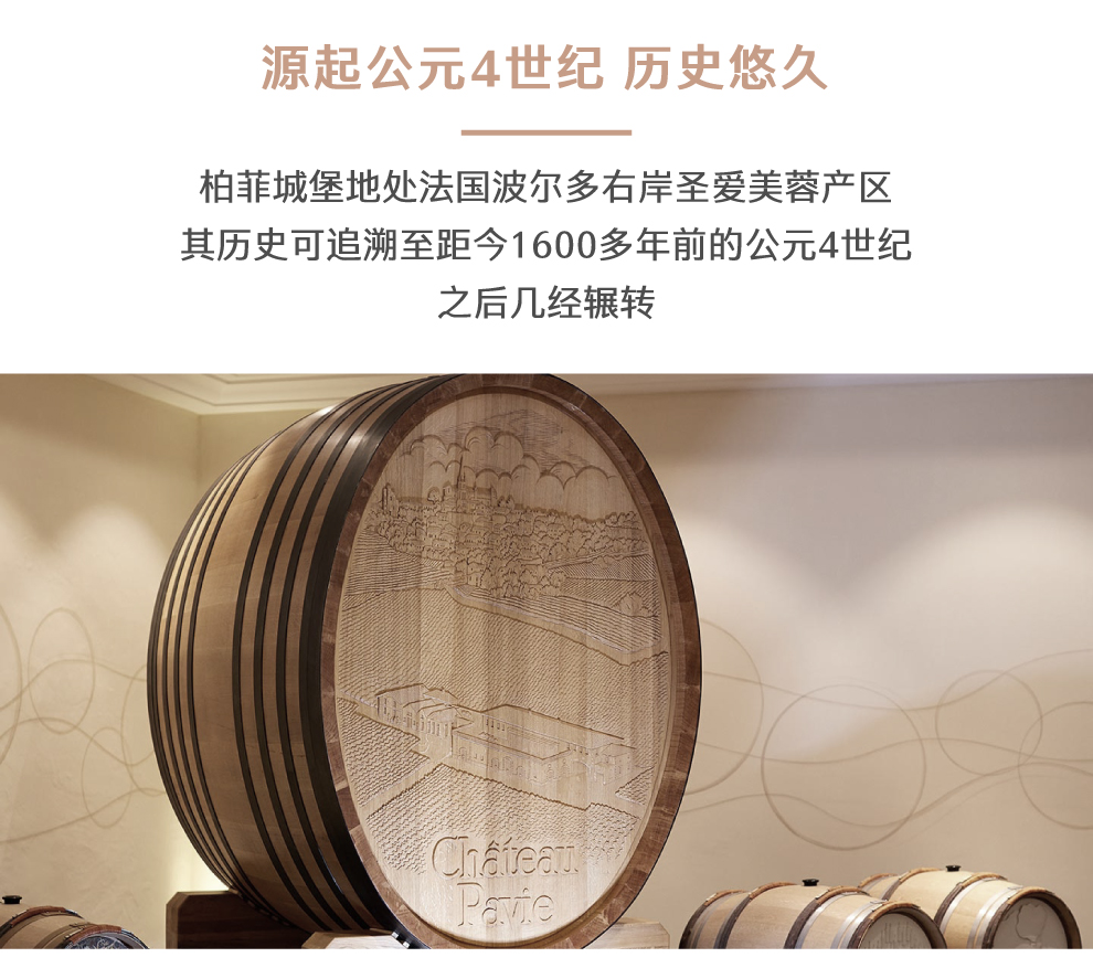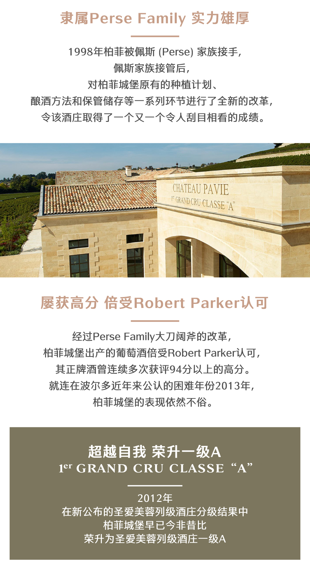 柏菲城堡地处法国波尔多右岸圣爱美蓉产区,其历史可追溯至距今1600多年前的公元4世纪。之后几经辗转1998年柏菲被佩斯 (Perse) 家族接手,佩斯家族接管后,对柏菲城堡原有的种植计划、酿酒方法和保管储存等一系列环节进行了全新的改革,令该酒庄取得了一个又一个令人刮目相看的成绩。