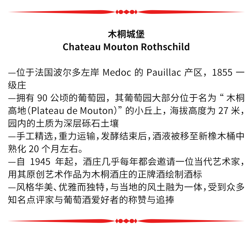 这些酒标囊括了印象派、抽象派、立体主义、表现主义、超现实主义、波普艺术以及涂鸦艺术等20世纪以来最重要的艺术流派,由此增加了趣味性和可藏性。在红酒爱好者心中,这一特色也让木桐成为五大酒庄中特例独行的艺术品牌。