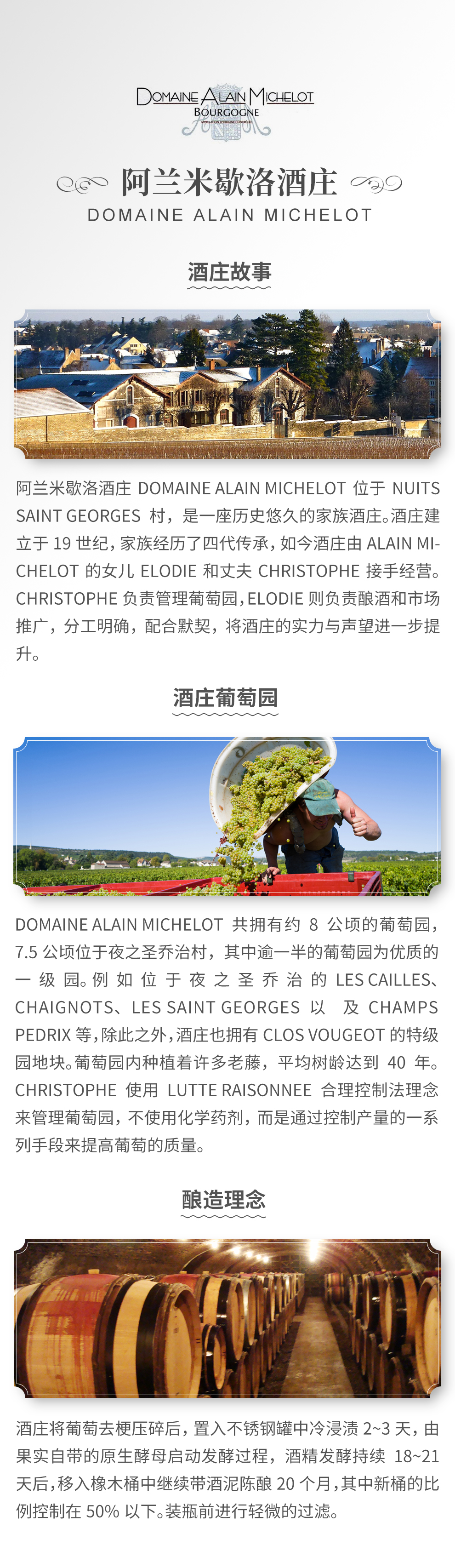 DOMAINE ALAIN MICHELOT共拥有约8公顷的葡萄园,7.5公顷位于夜之圣乔治村,其中逾一半的葡萄园为优质的一级园。例如位于夜之圣乔治的LES CAILLES、CHAIGNOTS、LES SAINT GEORGES以及CHAMPS PEDRIX等,除此之外,酒庄也拥有CLOS VOUGEOT的特级园地块。葡萄园内种植着许多老藤,平均树龄达到40年。CHRISTOPHE使用LUTTE RAISONNEE合理控制法理念来管理葡萄园,不使用化学药剂,而是通过控制产量的一系列手段来提高葡萄的质量。
