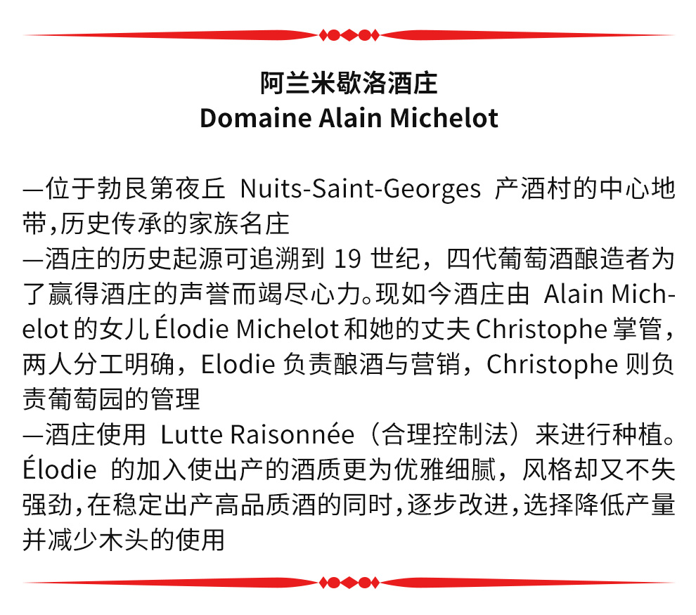 阿兰米歇洛酒庄DOMAINE ALAIN MICHELOT位于NUITS SAINT GEORGES村,是一座历史悠久的家族酒庄。酒庄建立于19世纪,家族经历了四代传承,如今酒庄由ALAIN MICHELOT的女儿ELODIE和丈夫CHRISTOPHE接手经营。CHRISTOPHE负责管理葡萄园,ELODIE则负责酿酒和市场推广,分工明确,配合默契,将酒庄的实力与声望进一步提升。