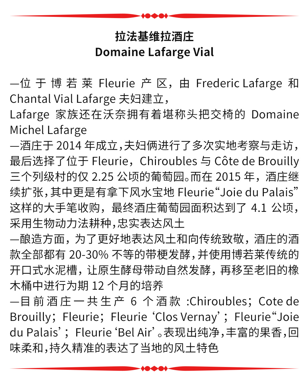 拉法基家族在沃奈拥有着堪称头把交椅的米歇尔拉法基酒庄(Domaine Michel Lafarge),但现任家族管理者,弗雷德里克(Frederic)和尚塔尔·拉法基(Chantal)在 2014 年的春天,决定在勃艮第以南的博若莱开始新的冒险。