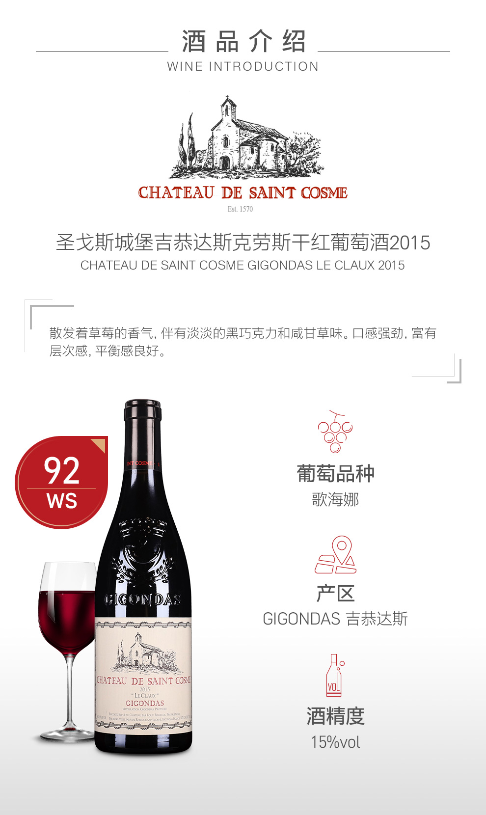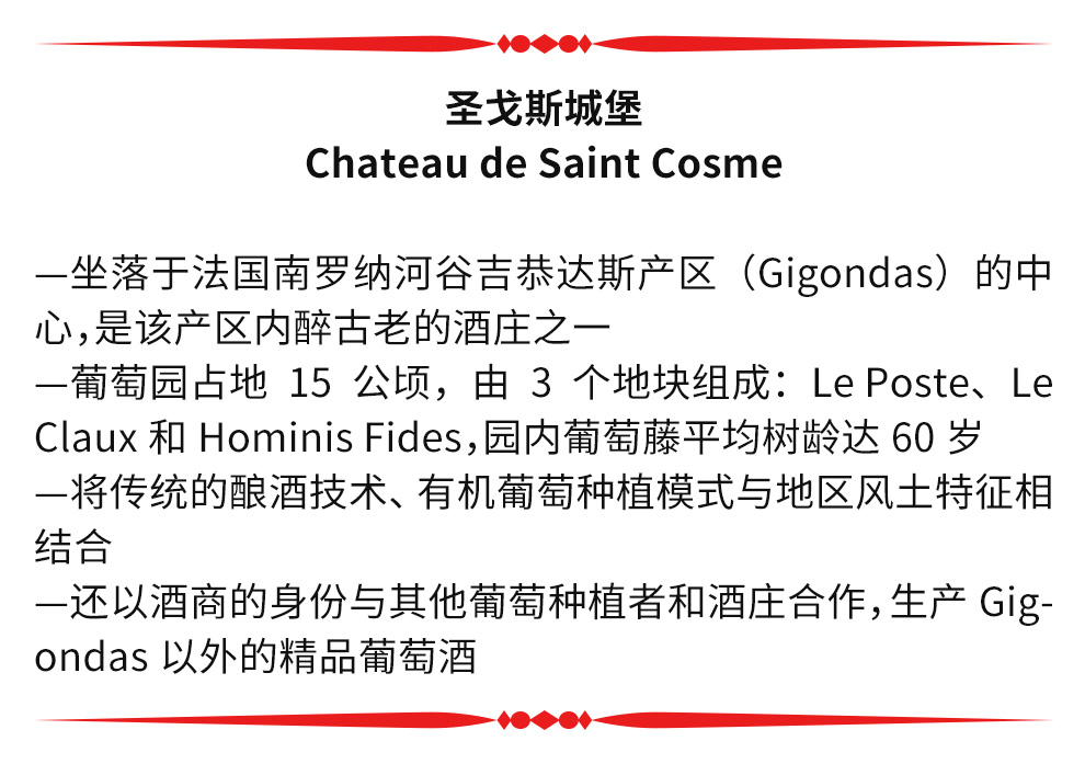 圣戈斯城堡(Chateau de Saint Cosme)坐落于法国南罗纳河谷(Southern Rhone Valley)吉恭达斯产区(Gigondas)的中心,是该产区内最古老的酒庄之一。
