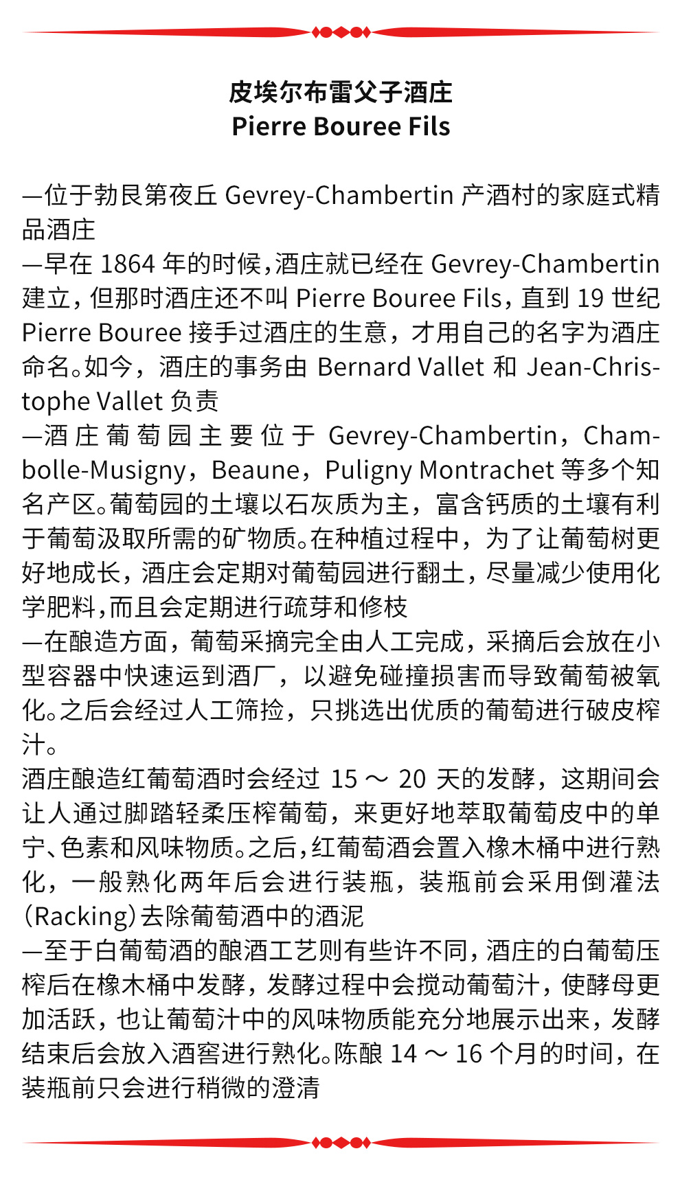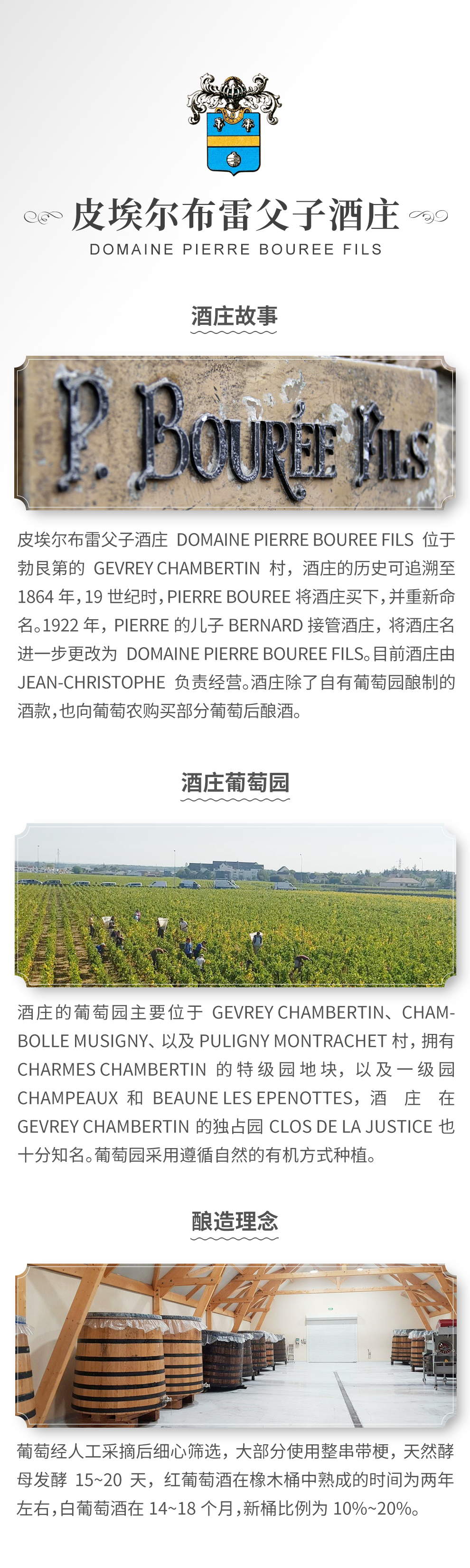 皮埃尔布雷父子酒庄DOMAINE PIERRE BOUREE FILS位于勃艮第的GEVREY CHAMBERTIN村,酒庄的历史可追溯至1864年,19世纪时,PIERRE BOUREE将酒庄买下,并重新命名。1922年,PIERRE的儿子BERNARD接管酒庄,将酒庄名进一步更改为DOMAINE PIERRE BOUREE FILS。目前酒庄由JEAN-CHRISTOPHE负责经营。酒庄除了自有葡萄园酿制的酒款,也向葡萄农购买部分葡萄后酿酒。