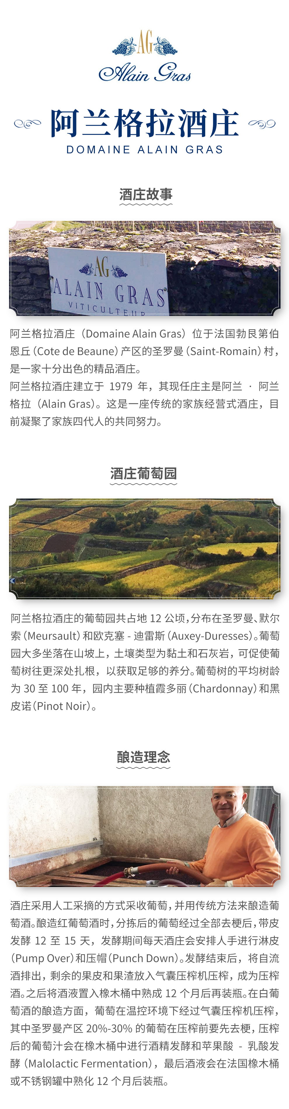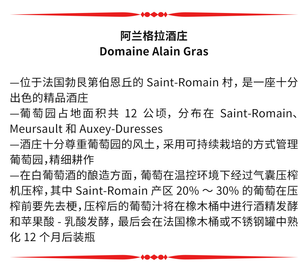 阿兰格拉酒庄(Domaine Alain Gras)位于法国勃艮第伯恩丘(Cote de Beaune)产区的圣罗曼(Saint-Romain)村,是一家十分出色的精品酒庄。