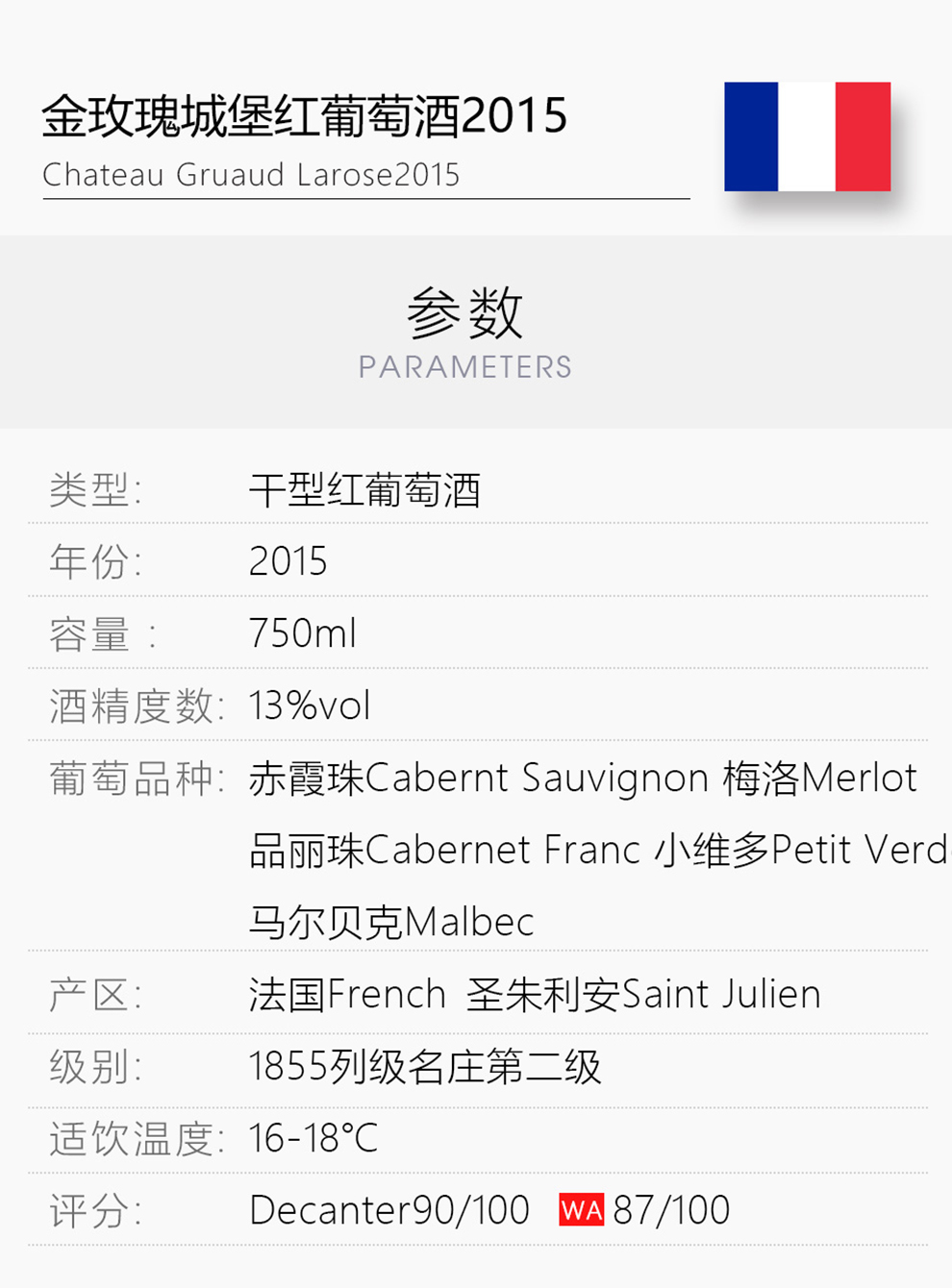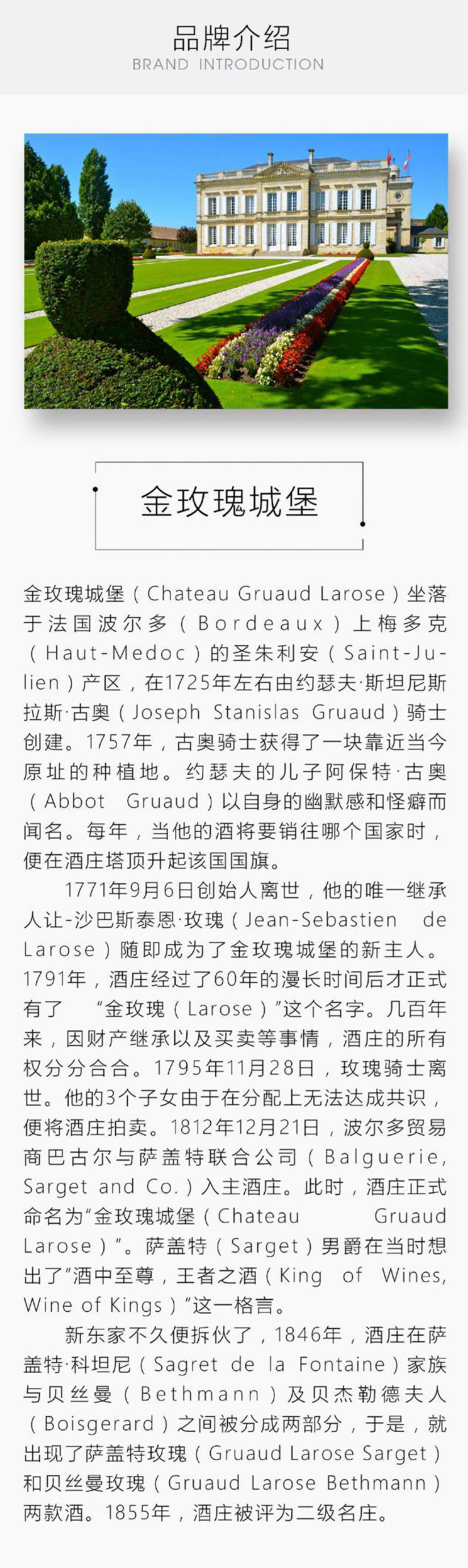 1855年梅多克分级二级庄Chateau Gruaud Larose位于波尔多左岸Saint Julien, 城堡于1725年建立, 而1791年时才正式有了Gruaud Larose这个名字, 几百年来因财产继承以及买卖等过程, 城堡所有权分分合合, 1917年Cordier家族先买下当时一分为二的Chateau Gruaud Larose其中一半的所有权-Gruaud Larose Sarget, 并于1935买下另一半Gruaud Larose Bethmann, 直到此时Chateau Gruaud Larose终于结束百多年来的分裂, 在Cordier家族的致力经营之下, 也出现了极为精采的1961年份, 以及1962, 1966, 1970年等佳酿。1970年开始酒庄引进新的技术团队, 由技术总监Georges Pauli领军, 1983年苏伊士Suez集团入主, 1993年又转手到艾卡特·艾斯森Alcatel Alsthom集团旗下, 引进计算机管理以及许多新科技, 并扩大厂房及更新酒窖设备, 使Chateau Gruaud Larose更为现代化, 1997年Merlaut家族入主, 现今庄主为Jean Merlaut, 1970年代开始虽然酒庄数度易主, 但仍由Georges Pauli执掌的技术团队负责酿酒。