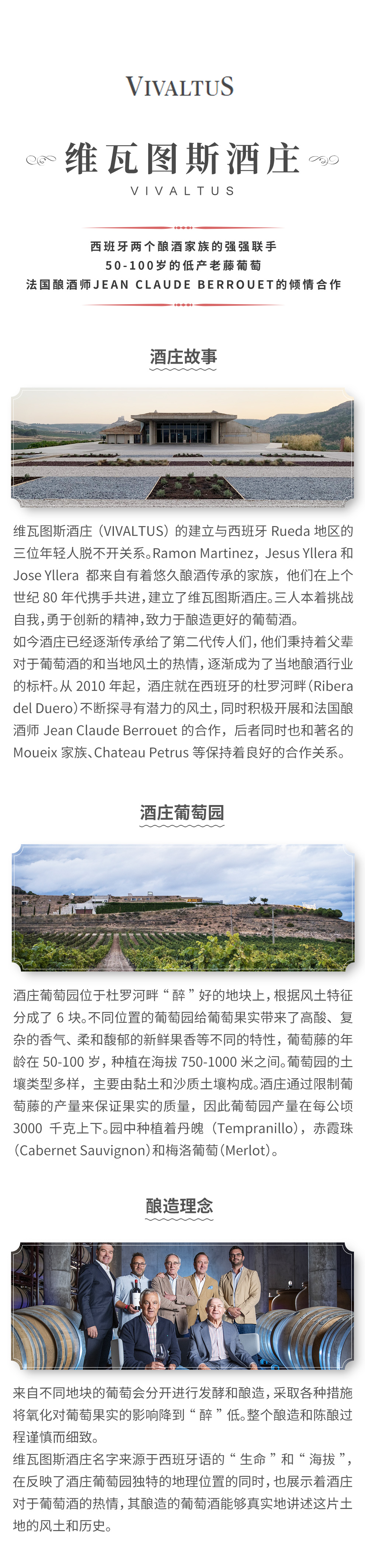 维瓦图斯酒庄名字来源于西班牙语的“生命”和“海拔”,在反映了酒庄葡萄园独特的地理位置的同时,也展示着酒庄对于葡萄酒的热情,其酿造的葡萄酒能够真实地讲述这片土地的风土和历史。