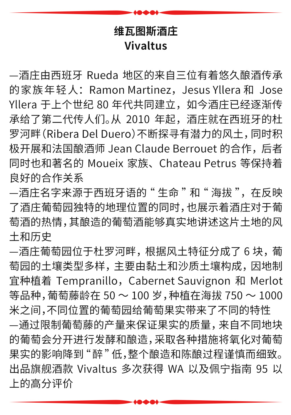 维瓦图斯酒庄(VIVALTUS)的建立与西班牙Rueda地区的三位年轻人脱不开关系。Ramon Martinez,Jesus Yllera 和Jose Yllera都来自有着悠久酿酒传承的家族,他们在上个世纪80年代携手共进,建立了维瓦图斯酒庄。三人本着挑战自我,勇于创新的精神,致力于酿造更好的葡萄酒。