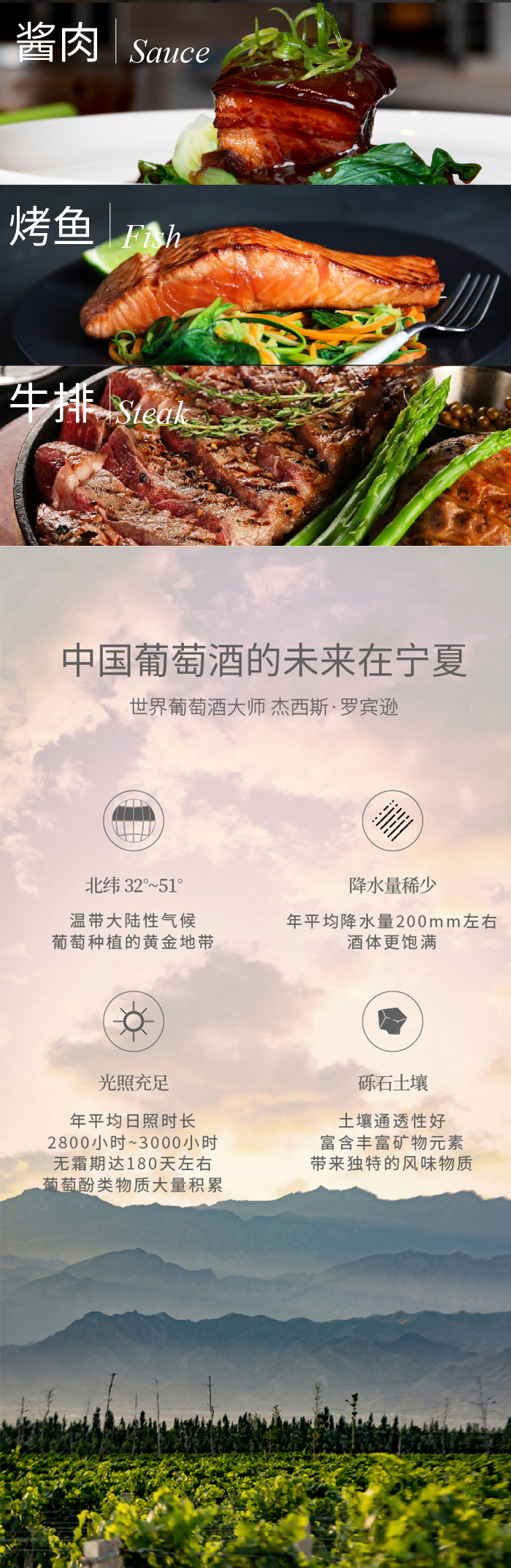 酒体颜色呈深宝石红带紫色色调,有浓郁的果香及丁香、枣花香,并伴有可可、咖啡的气息,使此款酒的香气复杂馥郁,酒体协调,有质感。