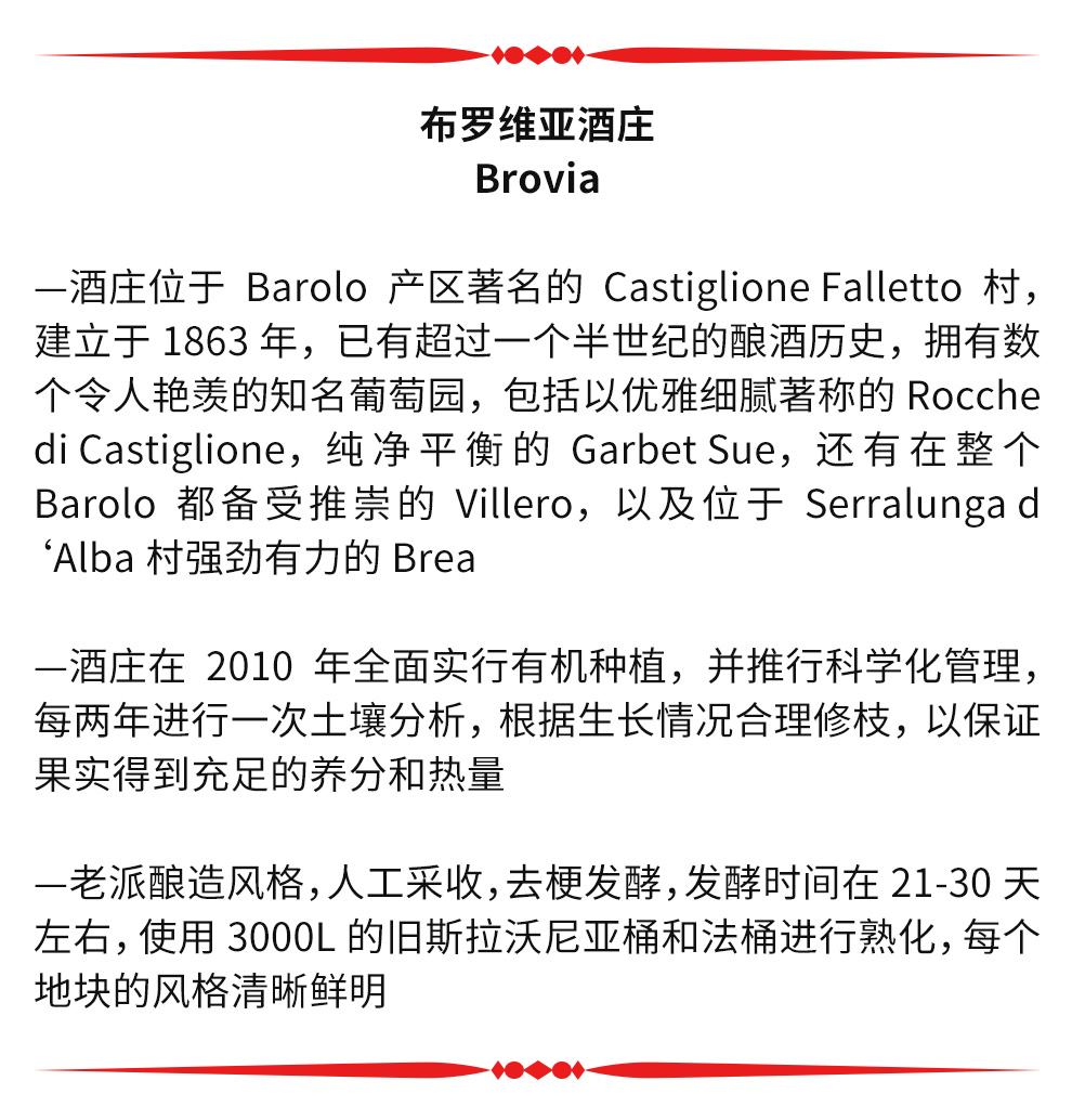Brovia庄园占地19.2公顷,其中55%的产量用于Barolo,25%用于Dolcetto,10%用于Barbera,其余10%来自Arneis,Nebbiolo d'Alba和Freisa。