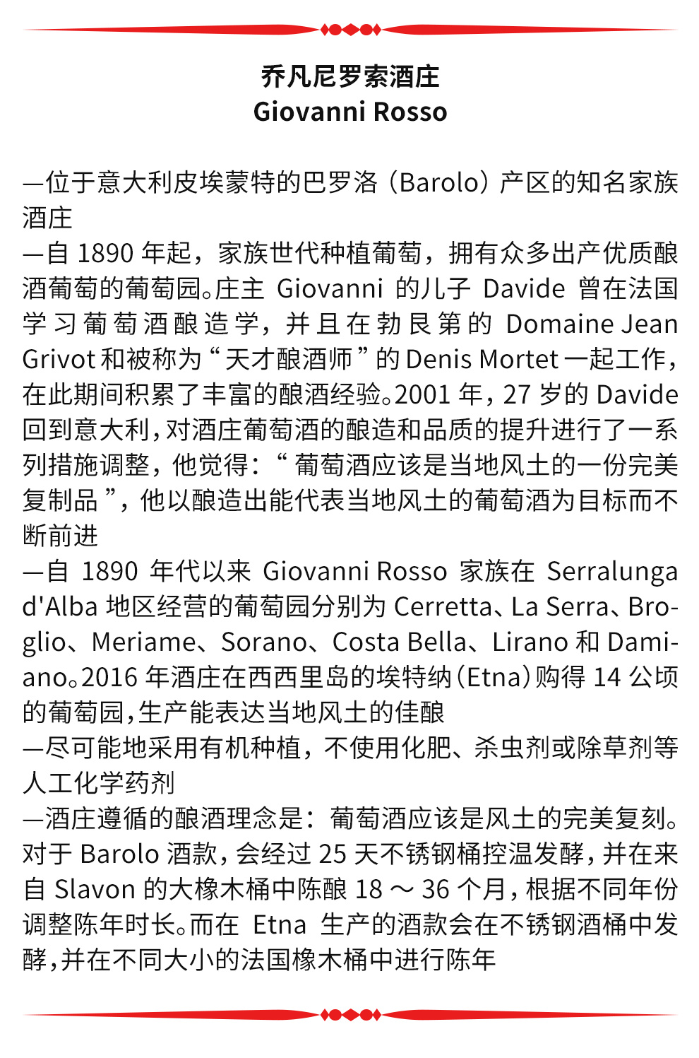 自1890年起,罗索(Rosso)家族世代种植葡萄,拥有众多出产优质酿酒葡萄的葡萄园。2001年,从法国学习酿酒的大卫·罗索(Davide Rosso)回到皮埃蒙特,开始接管酒庄,虽然他当时年仅27岁,但已是备受关注的青年酿酒师。接管酒庄之后,大卫以极其认真的态度投身于葡萄酒酿造,以酿造出最严谨的葡萄酒为目标,让酒庄的口碑不断上升。
