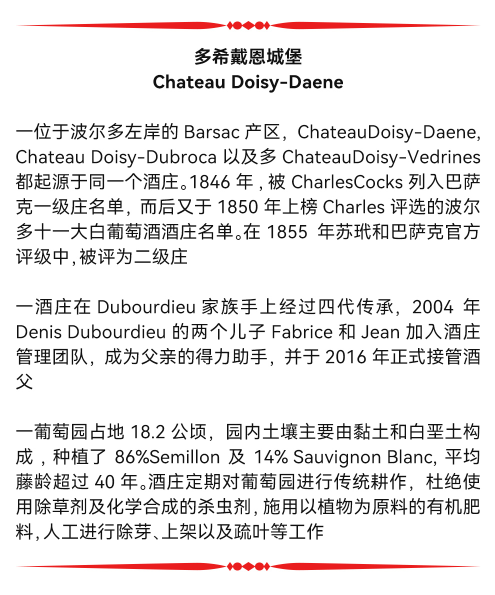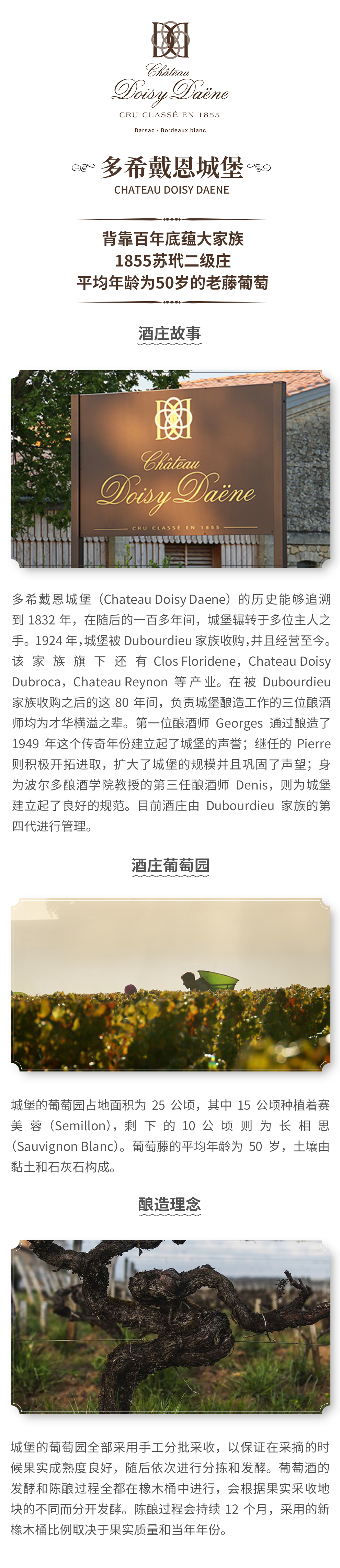 多希戴恩城堡(Chateau Doisy Daene)的历史能够追溯到1832年,在随后的一百多年间,城堡辗转于多位主人之手。1924年,城堡被Dubourdieu家族收购,并且经营至今。该家族旗下还有Clos Floridene,Chateau Doisy Dubroca,Chateau Reynon等产业。在被Dubourdieu家族收购之后的这80年间,负责城堡酿造工作的三位酿酒师均为才华横溢之辈。第一位酿酒师Georges通过酿造了1949年这个传奇年份建立起了城堡的声誉;继任的Pierre则积极开拓进取,扩大了城堡的规模并且巩固了声望;身为波尔多酿酒学院教授的第三任酿酒师Denis,则为城堡建立起了良好的规范。目前酒庄由Dubourdieu家族的第四代进行管理。