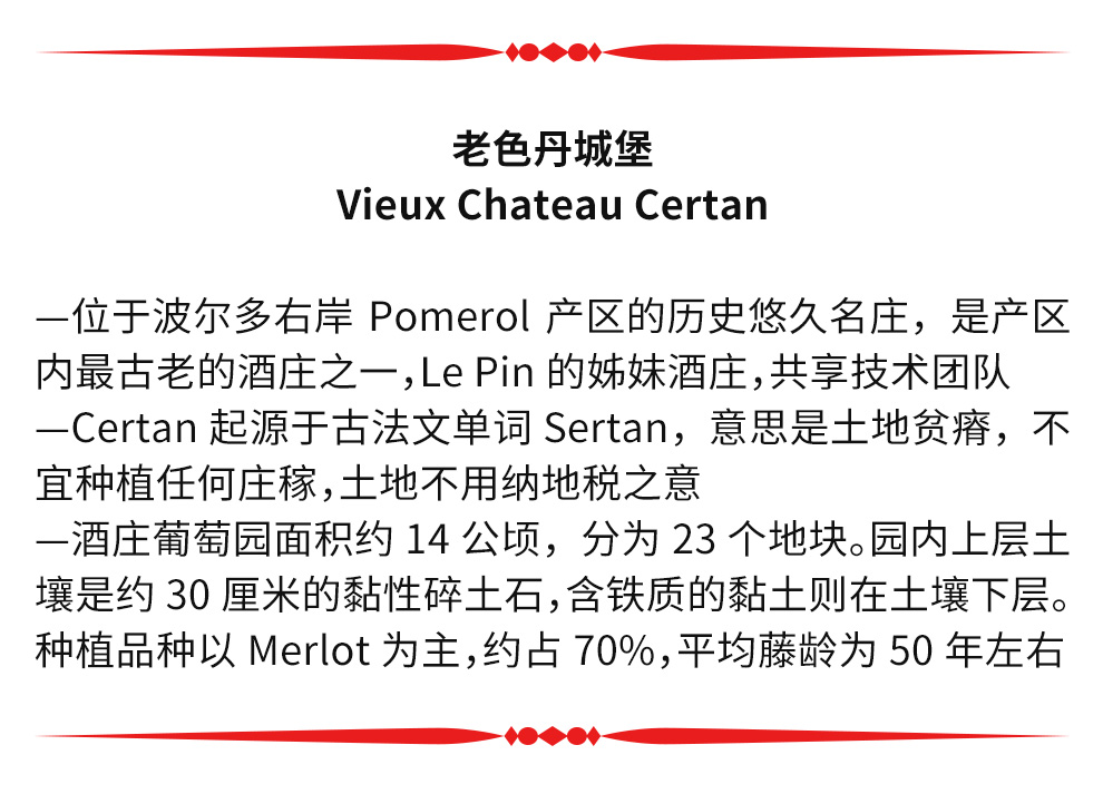 另外,Alexandre与其堂兄于1979年也购入了里鹏(Le Pin),但Alexandre只占1/6股份,负责里鹏葡萄树的种植管理。他的大部分时间还是花在老色丹城堡。现蒂安鹏(Thienpont)家族拥有两个波美侯地区最优秀的名庄。二十世纪中后期,柏图斯及里鹏的成绩实在太骄人了,所以老色丹的名气才被超过,但老色丹仍然是波美侯名列前茅的佳作。