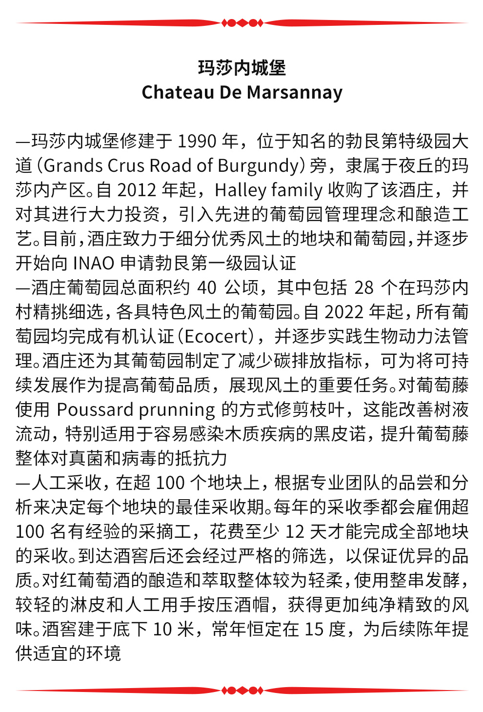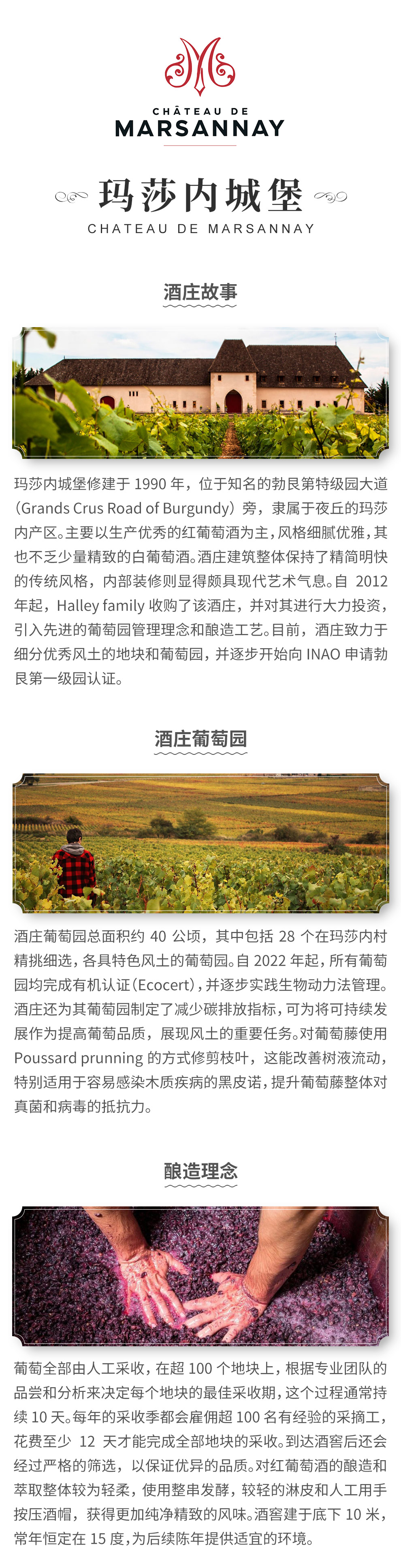 玛莎内城堡修建于1990年,位于知名的勃艮第特级园大道(Grands Crus Road of Burgundy)旁,隶属于夜丘的玛莎内产区。主要以生产优秀的红葡萄酒为主,风格细腻优雅,其也不乏少量精致的白葡萄酒。酒庄建筑整体保持了精简明快的传统风格,内部装修则显得颇具现代艺术气息。自2012年起,Halley family收购了该酒庄,并对其进行大力投资,引入先进的葡萄园管理理念和酿造工艺。目前,酒庄致力于细分优秀风土的地块和葡萄园,并逐步开始向INAO申请勃艮第一级园认证。