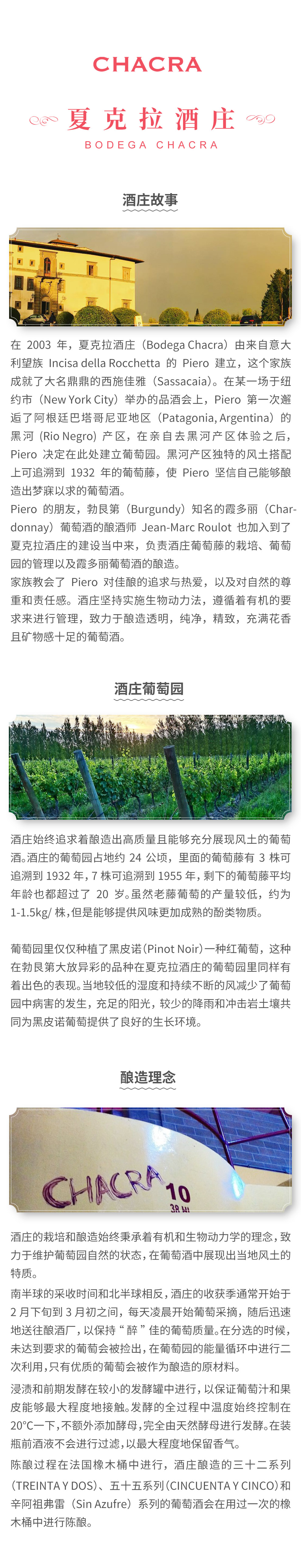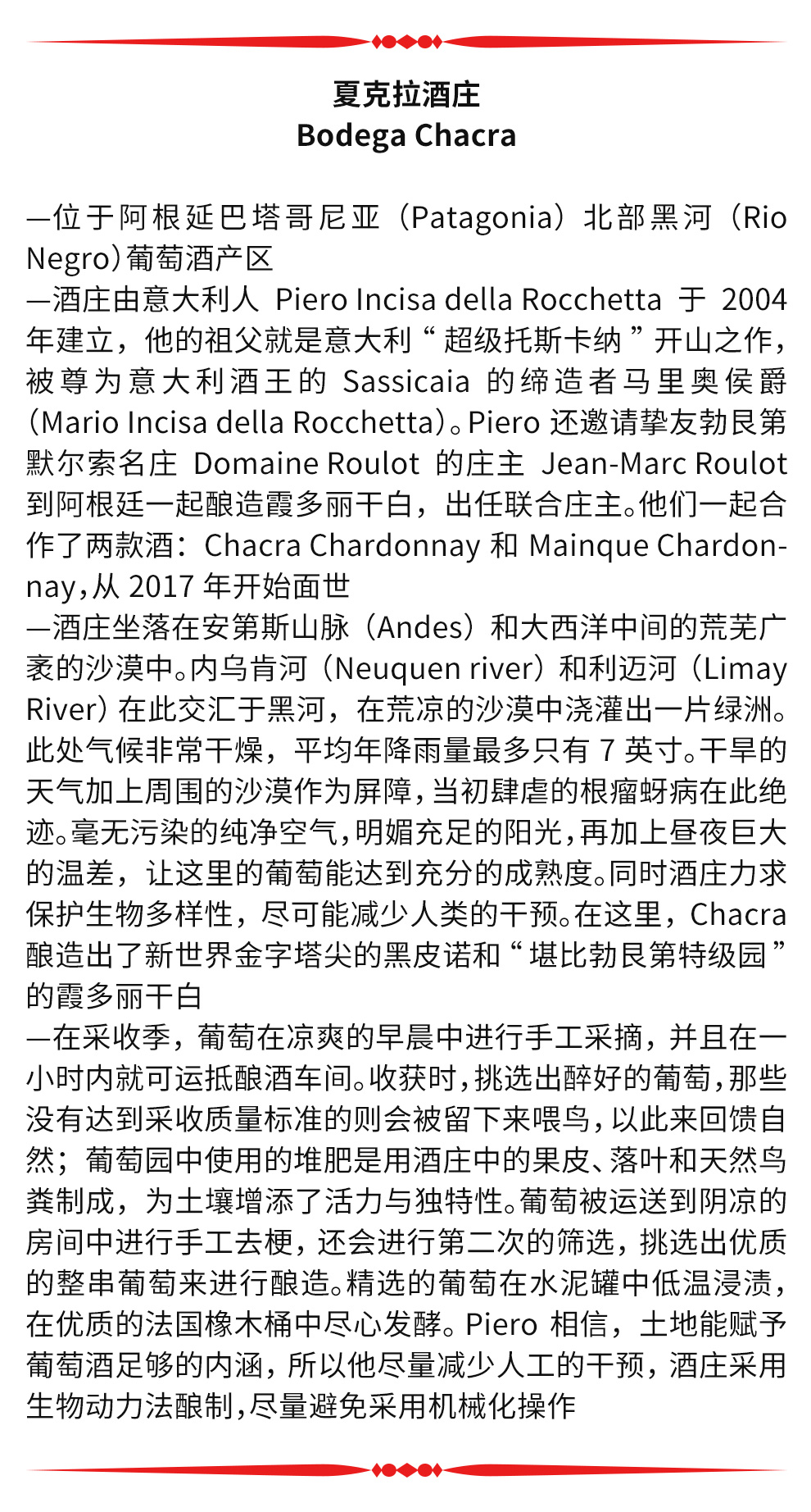在2003年,夏克拉酒庄(Bodega Chacra)由来自意大利望族Incisa della Rocchetta的Piero建立,这个家族成就了大名鼎鼎的西施佳雅(Sassacaia)。在某一场于纽约市(New York City)举办的品酒会上,Piero第一次邂逅了阿根廷巴塔哥尼亚地区(Patagonia, Argentina)的黑河(Rio Negro)产区,在亲自去黑河产区体验之后,Piero决定在此处建立葡萄园。黑河产区独特的风土搭配上可追溯到1932年的葡萄藤,使Piero坚信自己能够酿造出梦寐以求的葡萄酒。