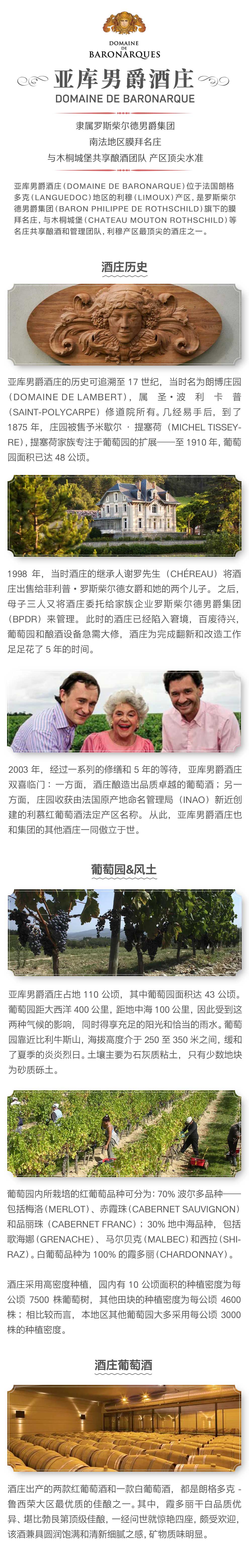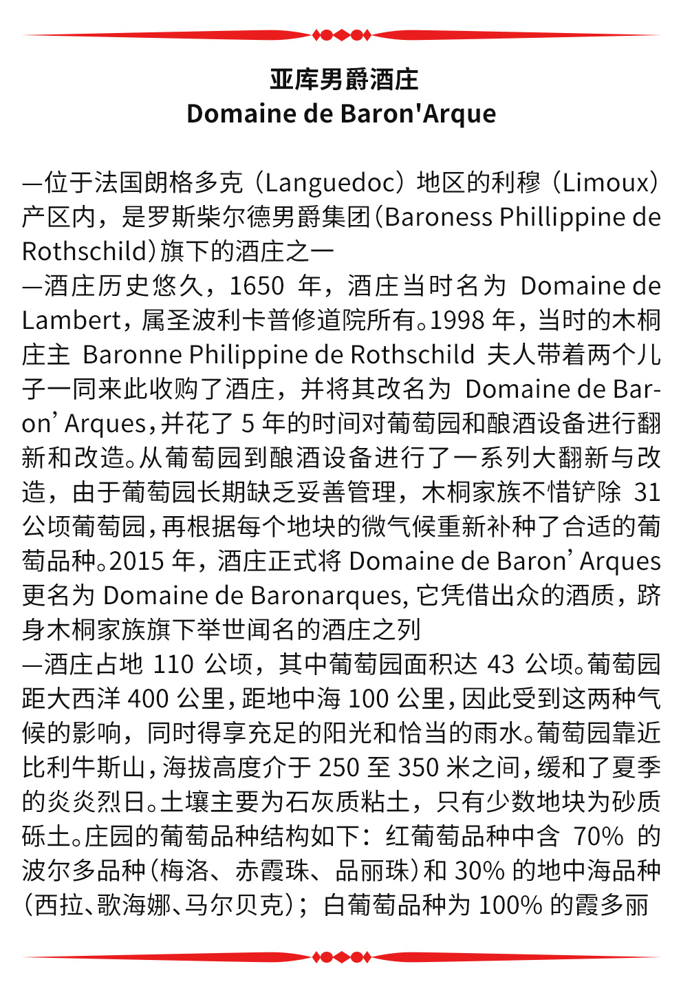 亚库男爵酒庄(Domaine de Baronarque)位于法国朗格多克(Languedoc)地区的利穆(Limoux)产区,是罗斯柴尔德男爵集团(Baron Philippe De Rothschild)旗下的膜拜名庄,与木桐城堡(Chateau Mouton Rothschild)等名庄共享酿酒和管理团队,利穆产区最顶尖的酒庄之一。