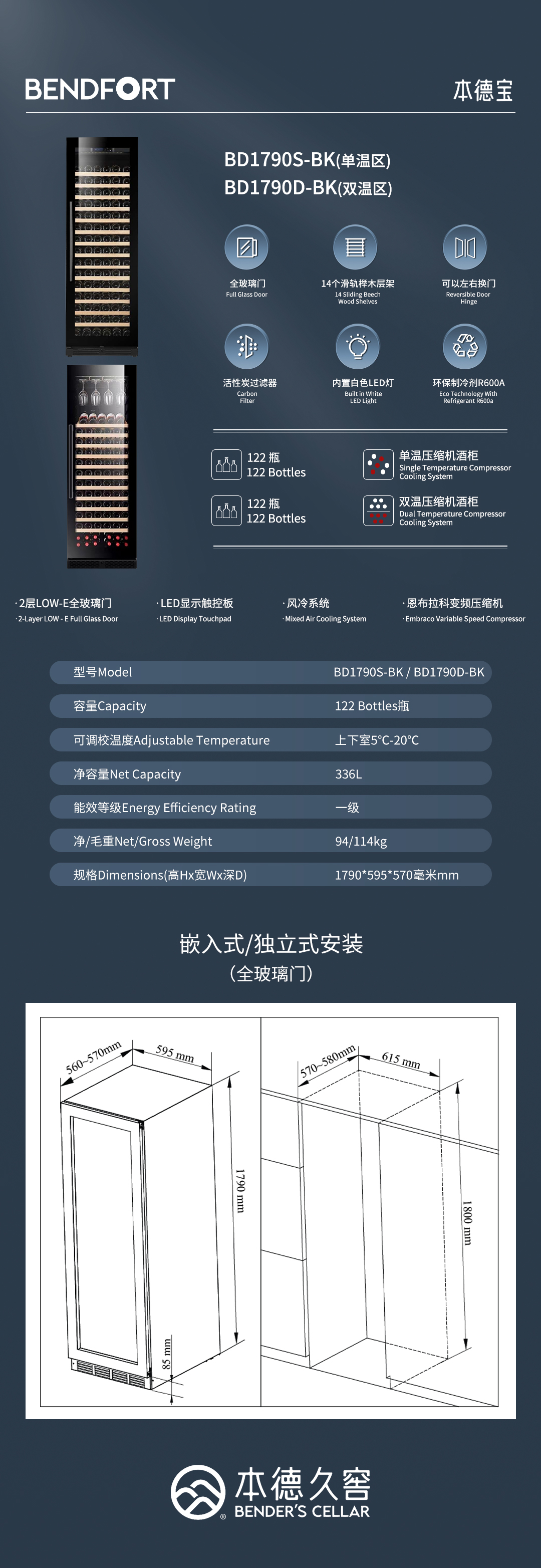 本德宝BENDFORT大型单温区独立嵌入两用恒温葡萄酒酒柜BD1790S-BK