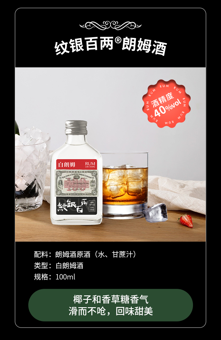 • 产品名称:100ml便携装样酒 纹银百两 洋酒调配型 朗姆酒洋酒 随身带随心喝