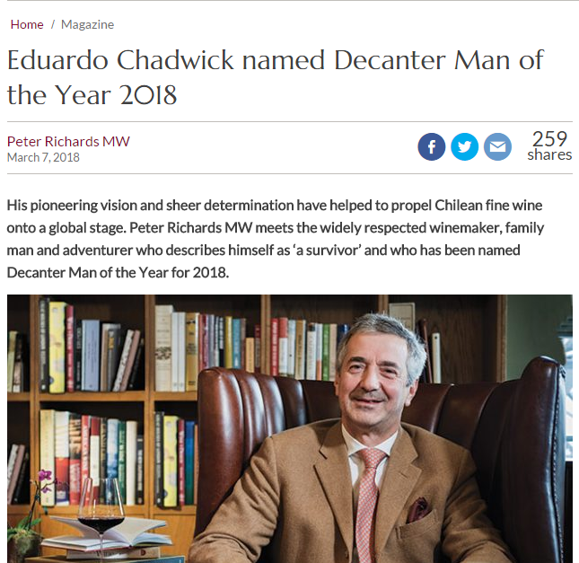 2018年3月,智利知名酒庄伊拉苏酒庄庄主爱德华多·查德威克(Eduardo Chadwick)获得了素有“葡萄酒行业诺贝尔奖”美誉的《醇鉴》“2018年度人物”(Decanter Man of the Year)称号。