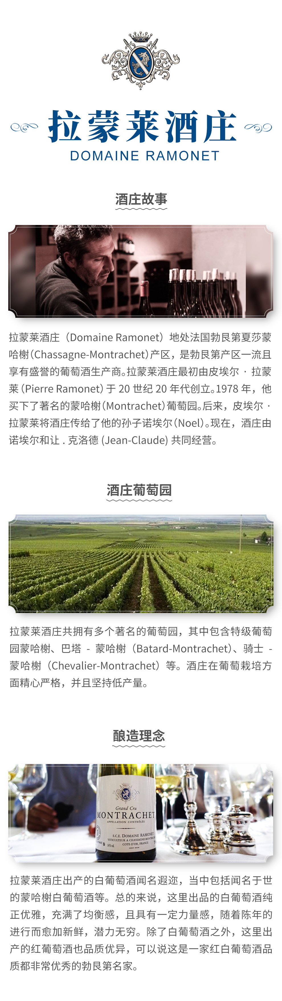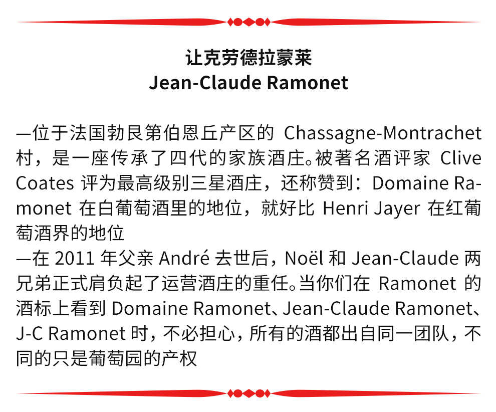 拉蒙莱酒庄(Domaine Ramonet)地处法国勃艮第夏莎蒙哈榭(Chassagne-Montrachet)产区,是勃艮第产区一流且享有盛誉的葡萄酒生产商。