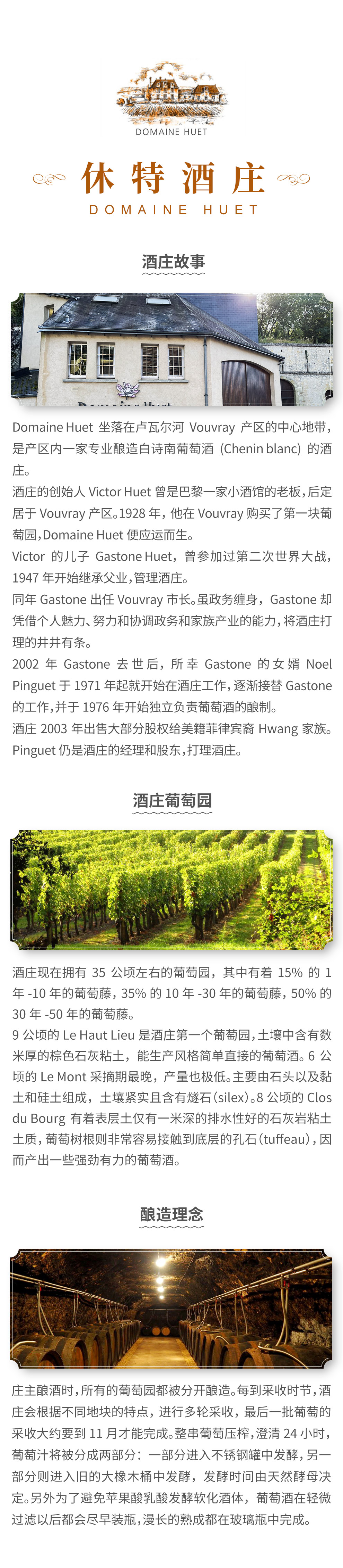 酒庄的创始人Victor Huet曾是巴黎一家小酒馆的老板,后定居于Vouvray产区。1928年,他在Vouvray购买了第一块葡萄园,Domaine Huet便应运而生。