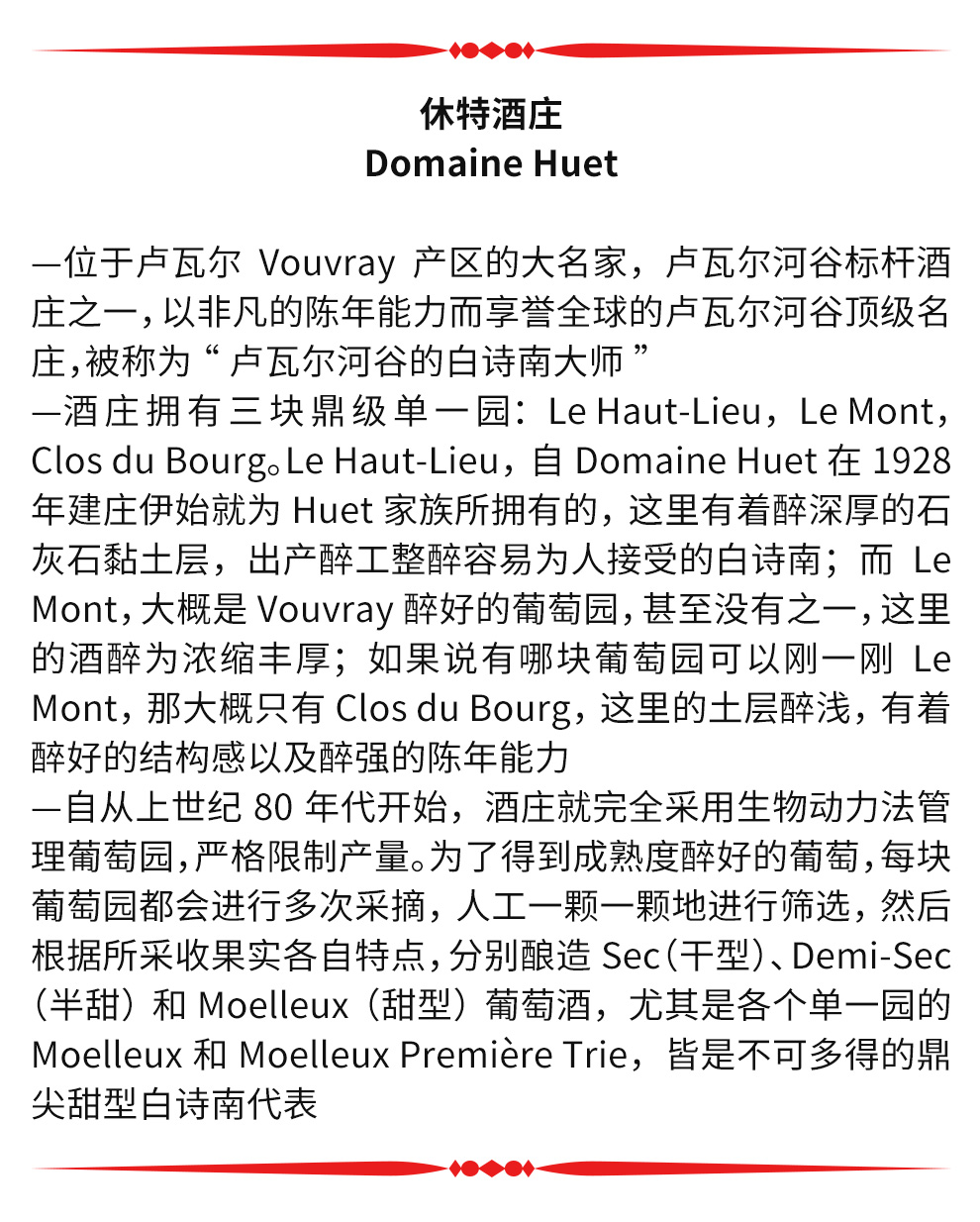 Domaine Huet坐落在卢瓦尔河Vouvray产区的中心地带,是产区内一家专业酿造白诗南葡萄酒(Chenin blanc)的酒庄。