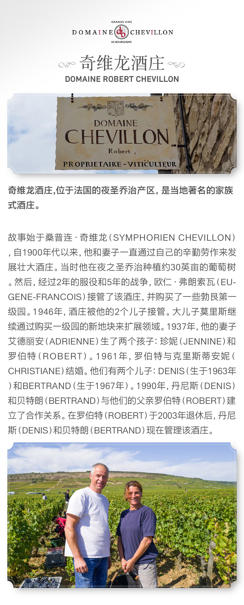1961年,Robert与Christiane结婚,几年后两个儿子Denis和Bertrand出生。为了酒庄能够很好的传承下去,保证酒庄的整体性,父子三人在1990年创建了共同的SCEV(全称Société Civile d’Exploitation Viticole,即农业经营民事公司,至少两个合伙人,无最低或最高资本额的限制,是一种非常宽松的农业或林业组织形式)。2003年,Robert Chevillon退休,Denis和Bertrand正式接管酒庄,但Robert也依然积极参与酒庄的各项事务。酒庄在父子三人的共同努力静一下,风生水起。