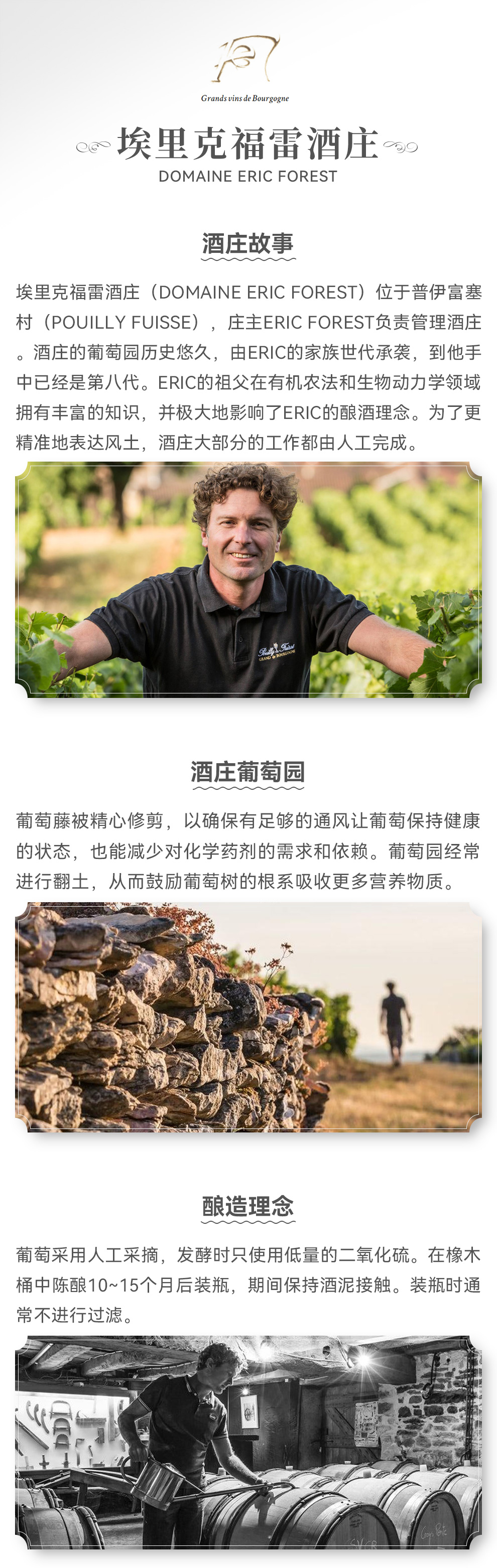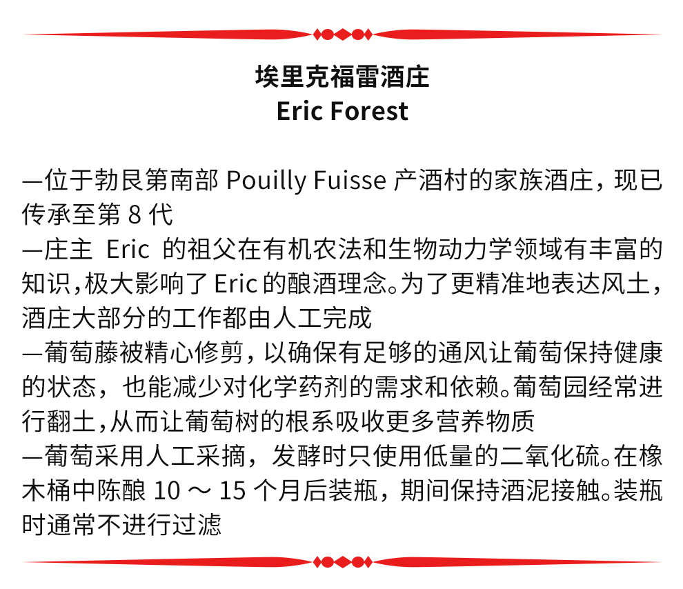 埃里克福雷酒庄(DOMAINE ERIC FOREST)位于普伊富塞村(Pouilly Fuisse),庄主Eric Forest负责管理酒庄。酒庄的葡萄园历史悠久,由Eric的家族世代承袭,到他手中已经是第八代。Eric的祖父在有机农法和生物动力学领域拥有丰富的知识,并极大地影响了Eric的酿酒理念。为了更精准地表达风土,酒庄大部分的工作都由人工完成。