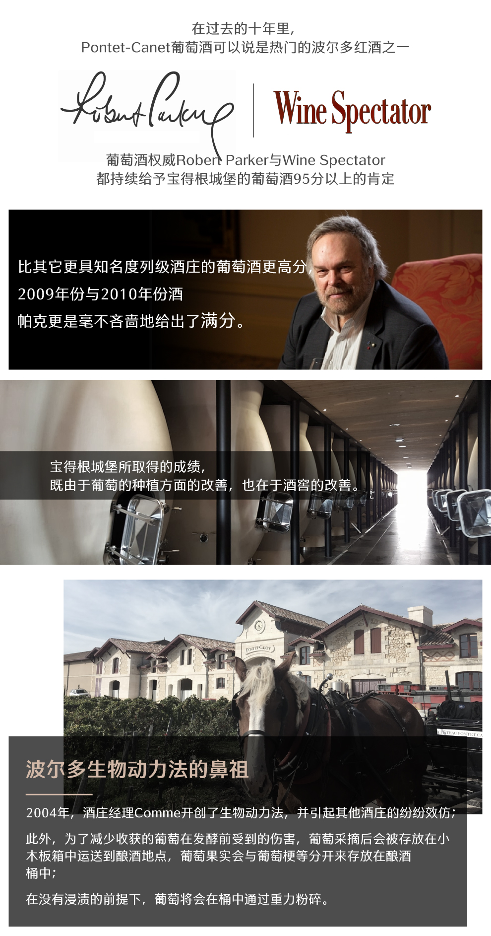 在过去的十年里, Pontet-Canet葡萄酒可说是最热门的波尔多红酒之一。葡萄酒权威Robert Parker与Wine Spectator都持续给予这支酒95分以上的肯定,比其它更具知名度列级酒庄的葡萄酒更高分。2009与2010帕克更是毫不吝啬地给出了满分。