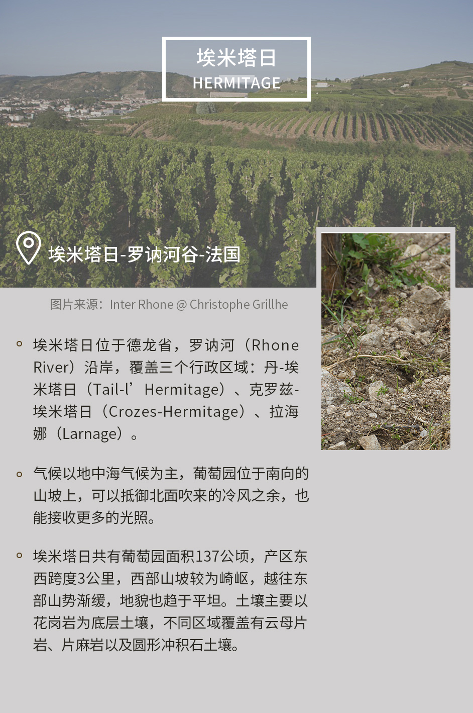 嘉伯乐酒庄位于埃米塔日的葡萄园坐落于海拔130至250米的梯田上,较低处的土壤为沙土、碎石和砾石块,较高处为棕色土和岩石土。园地面积仅26公顷,除了5公顷种植白葡萄品种的园地,红葡萄种植园地仅21公顷,散布在埃米塔日丘陵顶部的小教堂附近。每公顷种植6,000株西拉(Syrah)葡萄 树,平均树龄45年,每公顷产酒3,000升。埃米塔日丘陵上不仅种植葡萄,也种植了相同比例的樱桃、生梨等水果,葡萄园周围种植水果,常常会使葡萄中带上相同水果的香气。