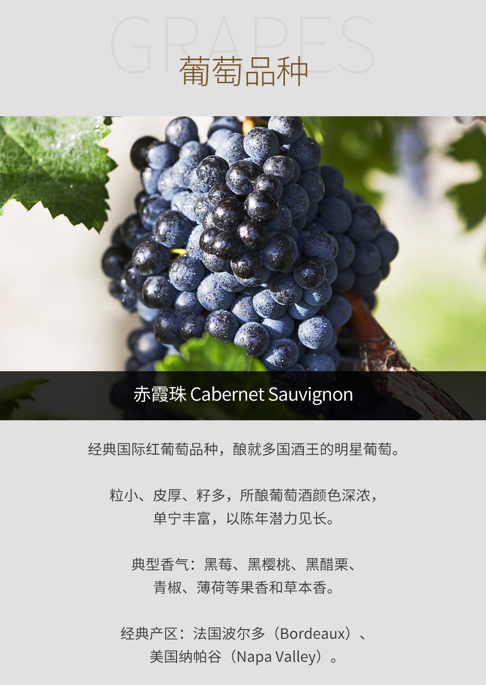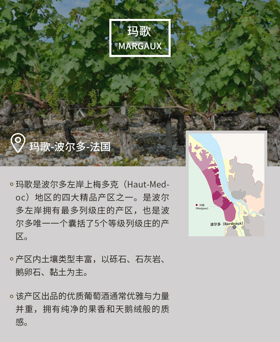 · 葡萄种植比例: 65%赤霞珠, 25%梅洛, 10%品丽珠和小维度,