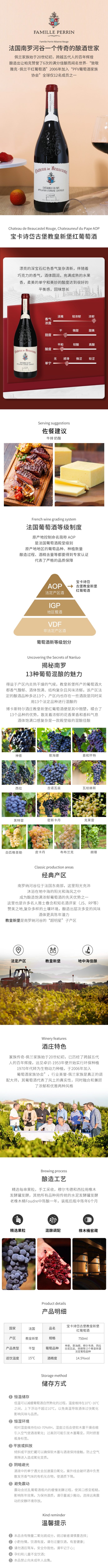 佩兰家族遵循传统的酿造方式,并结合以现代科技,尽可能少的进行人工干预,尽量让葡萄自然的表达其风味。如今,佩兰家族已经传承至第五代,从法国罗讷河谷到普罗旺斯,再到美国西海岸,他们从未停止探索葡萄酒的灵魂所在。
