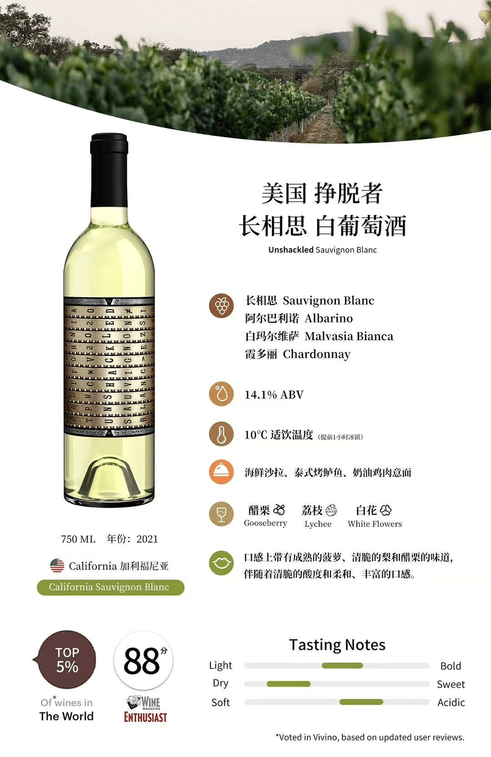 加州创新厂牌囚徒酒庄出品,Unshackled 系列爆款,打破传统长相思风格。