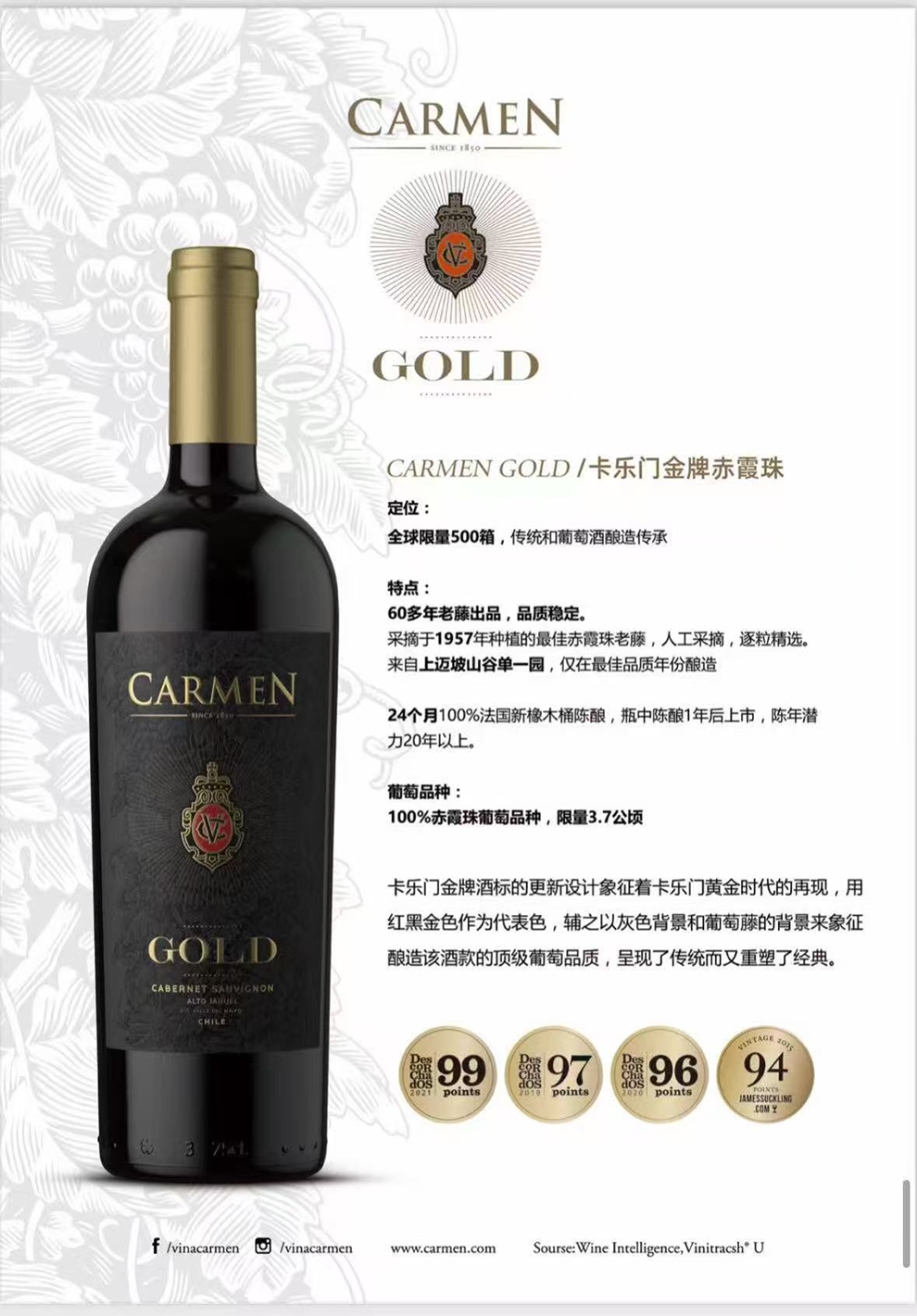 智利葡萄酒年鉴99分,60年老藤,24个月法国橡木桶陈酿+12个月瓶中陈酿,20年以上陈年潜力。