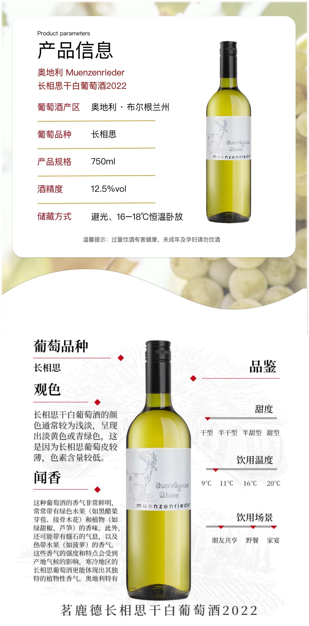 • 产品名称:茗鹿德长相思干白葡萄酒 2022