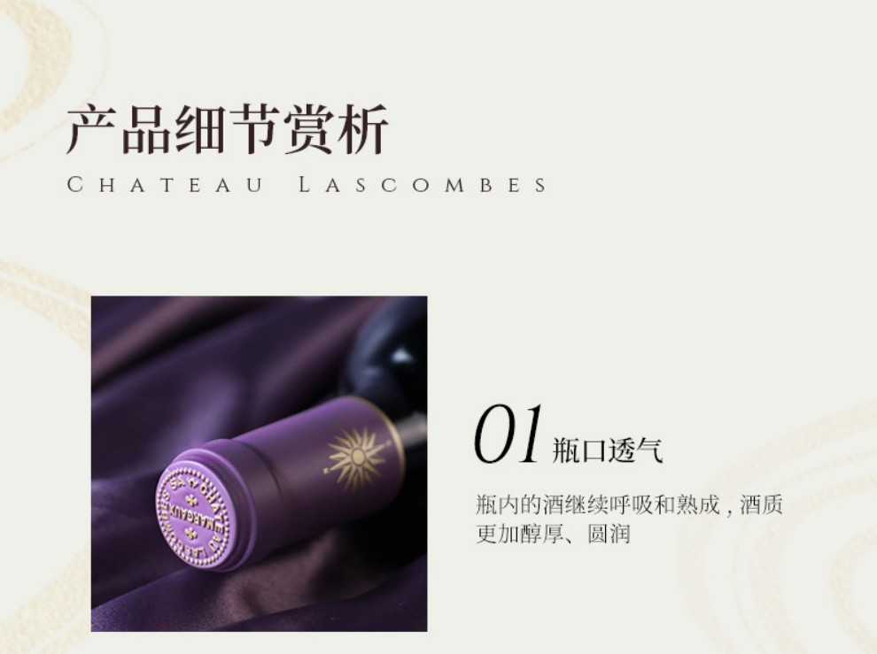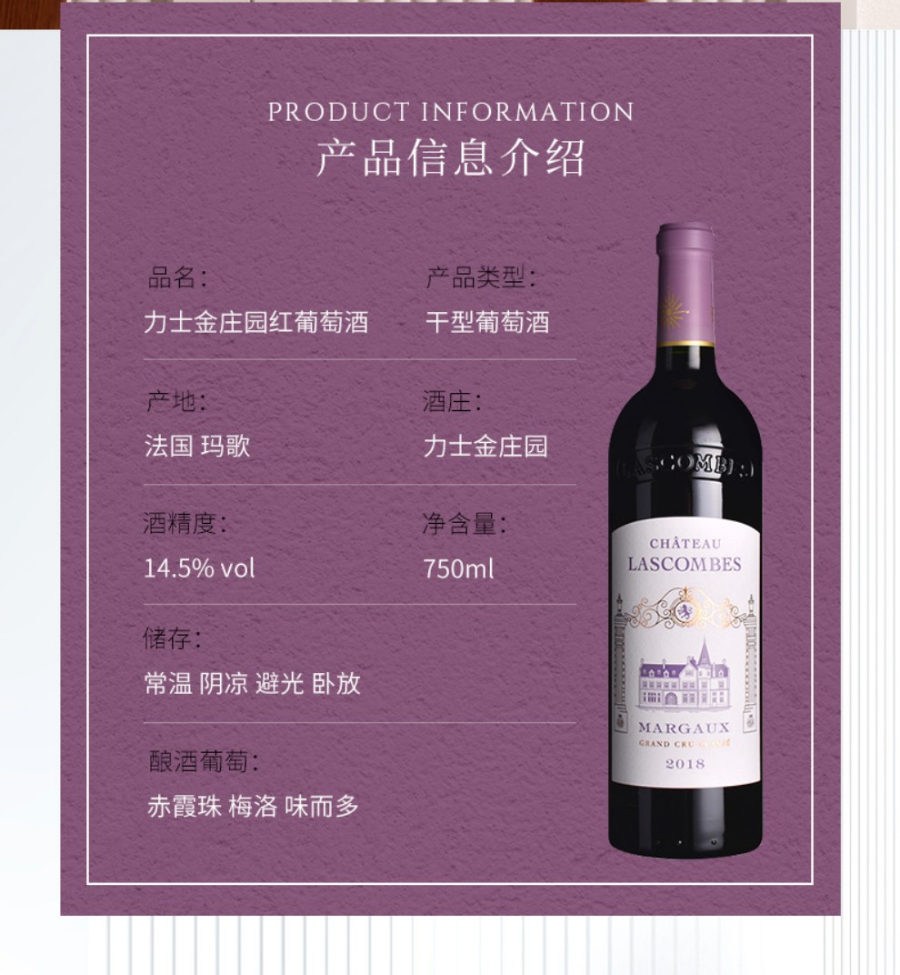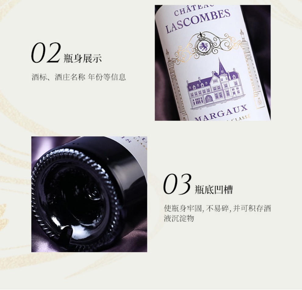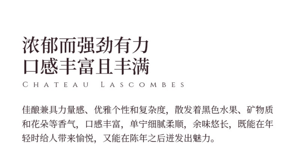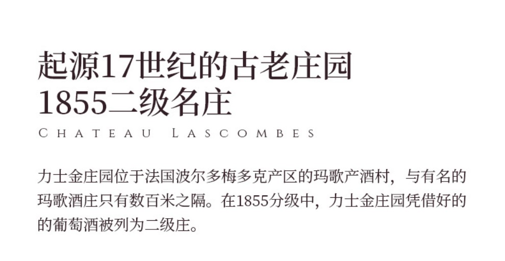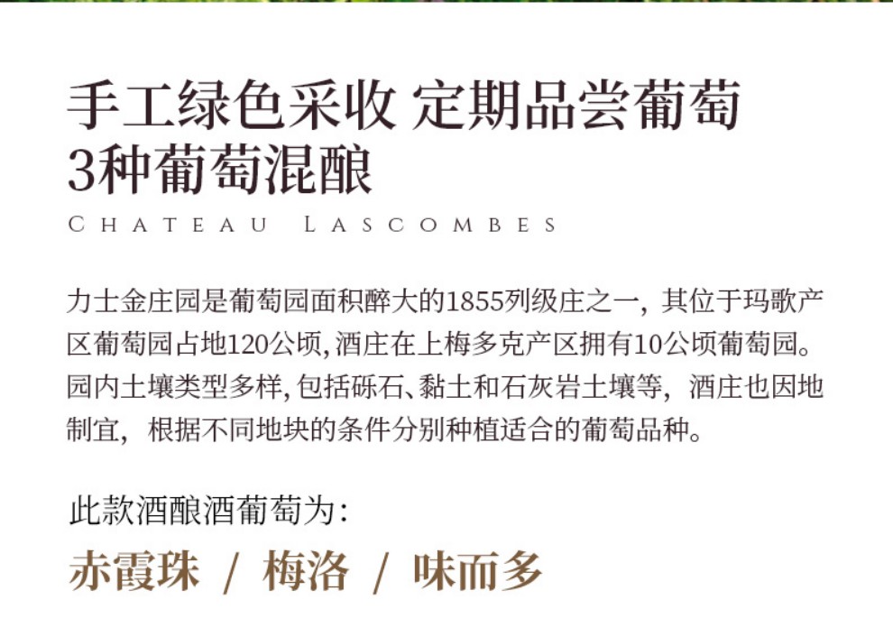 Lascombes 为波尔多1855年梅多克二级酒庄,也是梅多克(Medoc)区面积最大的酒庄之一,所拥有的地块十分的分散,在玛歌(Margaux)产区拥有大约40 个以上的酒园。 Lascombes 由赤霞珠(Cabernet Sauvignon)梅洛( Merlot) 小维尔多(Petit Verdot) 混合酿成,并在60% 新橡木桶中醇化18个月。酒庄风格以出产典雅均衡且充满黑醋栗果味的酒款闻名,陈年后更加深其复杂度。2001 年延续2000 年的成功,在 Yves Vatelot (Ch. Reignac) 及Dr. Alain Raynaud (Ch. Quinault l’Enclos) 的指导下持续酿造出绝佳的质量。酒中含有圆润的花香、蓝莓、黑莓以及黑茶子香气,甜美的单宁以及令人印象深刻的集中度。尾韵十分悠长。发酵前处理在8℃下持续一个星期;28℃下酒精发酵,30℃下浸皮;在橡木桶中进行苹果乳酸发酵,温度控制在21℃;正牌酒和副牌酒都要带酒槽熟化4个月 ;每三个月通过压缩空气进行一次滗析;使用传统的蛋清澄清法。在橡木桶中陈酿18-20个月。