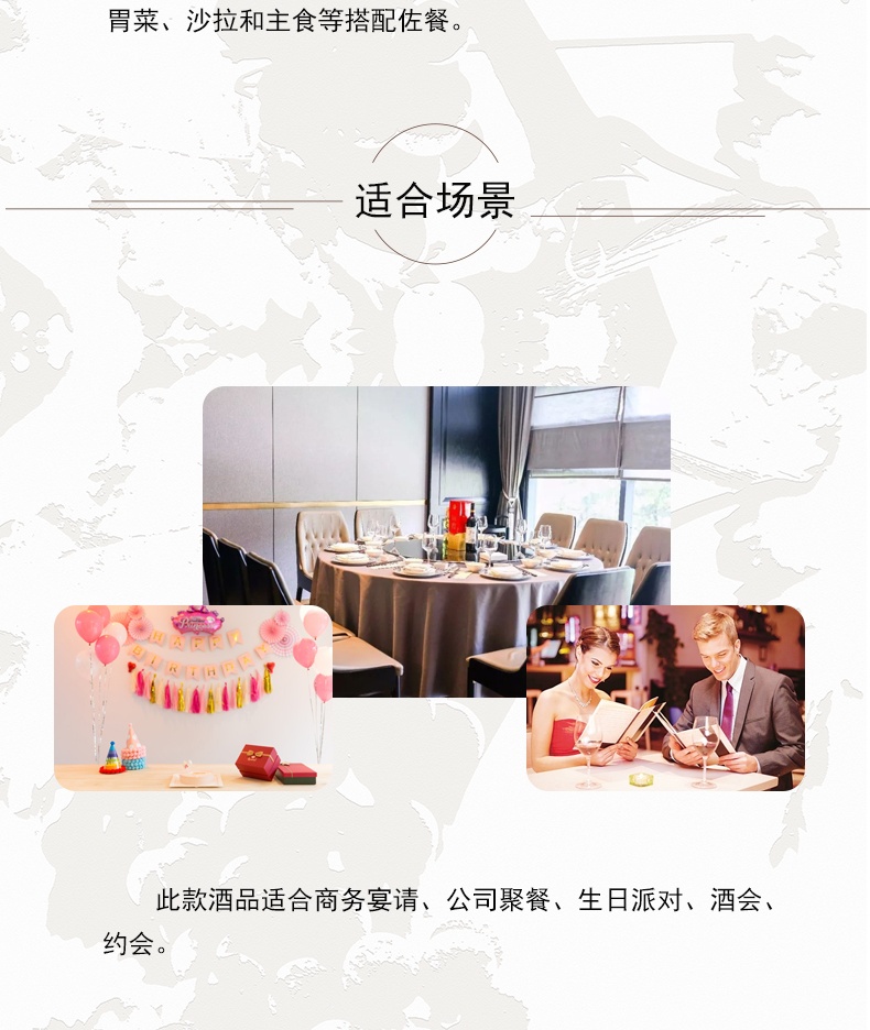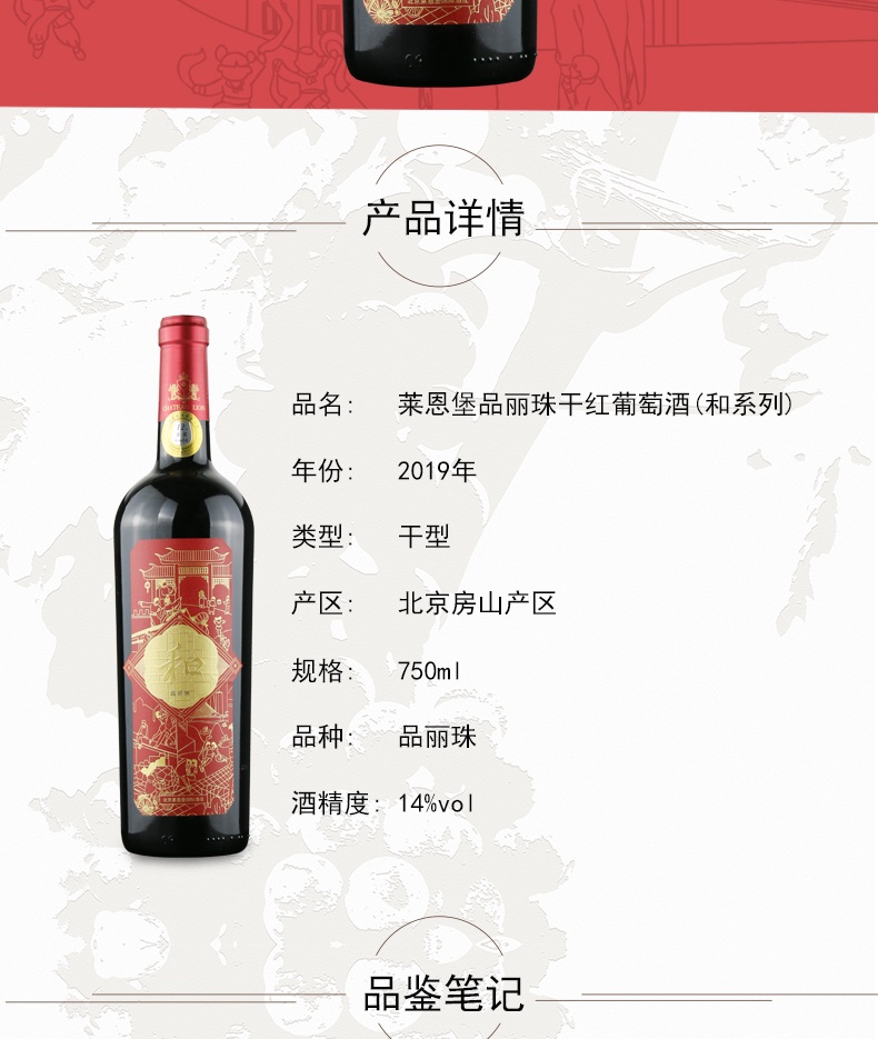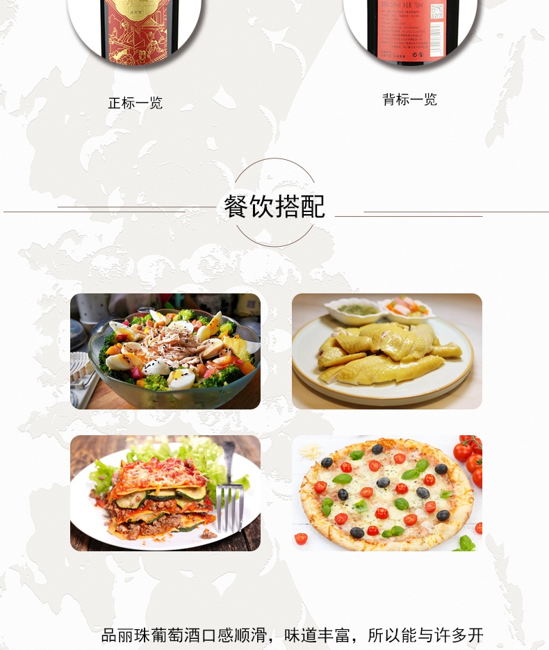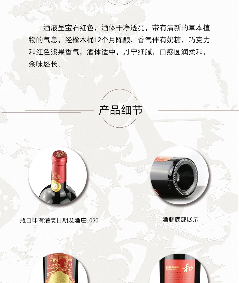 颜色:呈宝石红色,酒体干净透亮香气:带有清新草本植物的气息,伴有奶糖、巧克力,薄荷香气,松露,蘑菇香气馥郁充足口感:单宁细腻,酒体柔和协调,适口感强