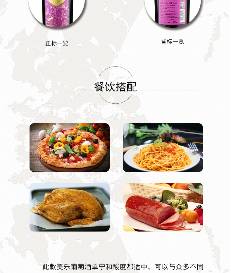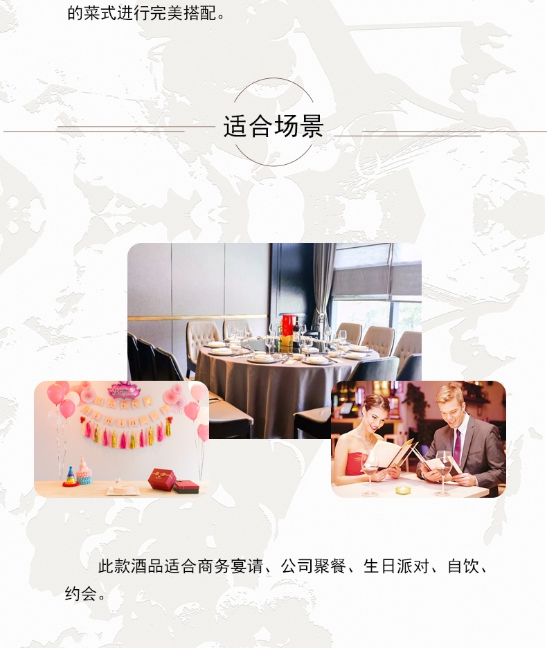 颜色:呈浅宝石红色,酒体干净香气:红色浆果香气浓郁,伴有烤面包、蜂蜜、咖啡等香气口感:酒体适中,单宁轻柔,如丝绒般圆润细腻