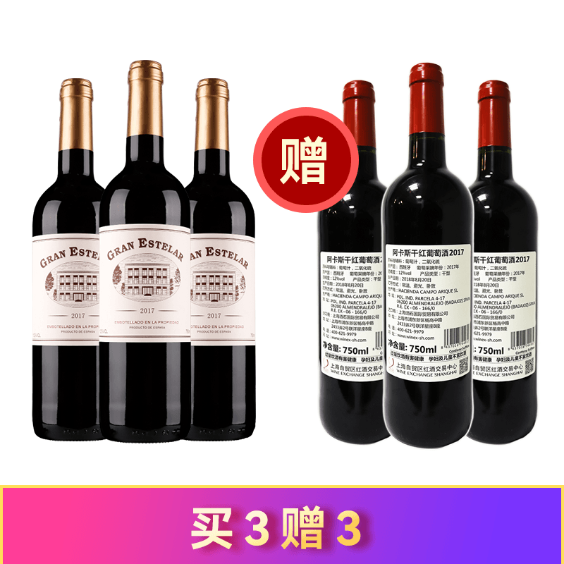 【买三赠三】星眼干红葡萄酒2017*3瓶,再赠3瓶西班牙进口葡萄酒
